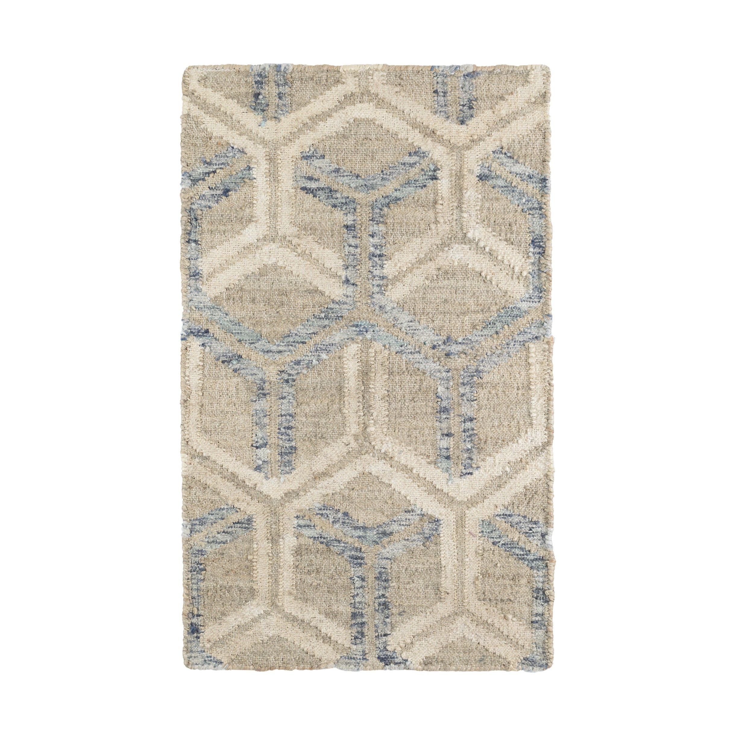 Handwoven jute rug featuring interlocking honeycomb motifs in blue and natural tones. Durable and low-maintenance, ideal for high-traffic areas and homes with kids and pets. Adds warmth and texture to any space.