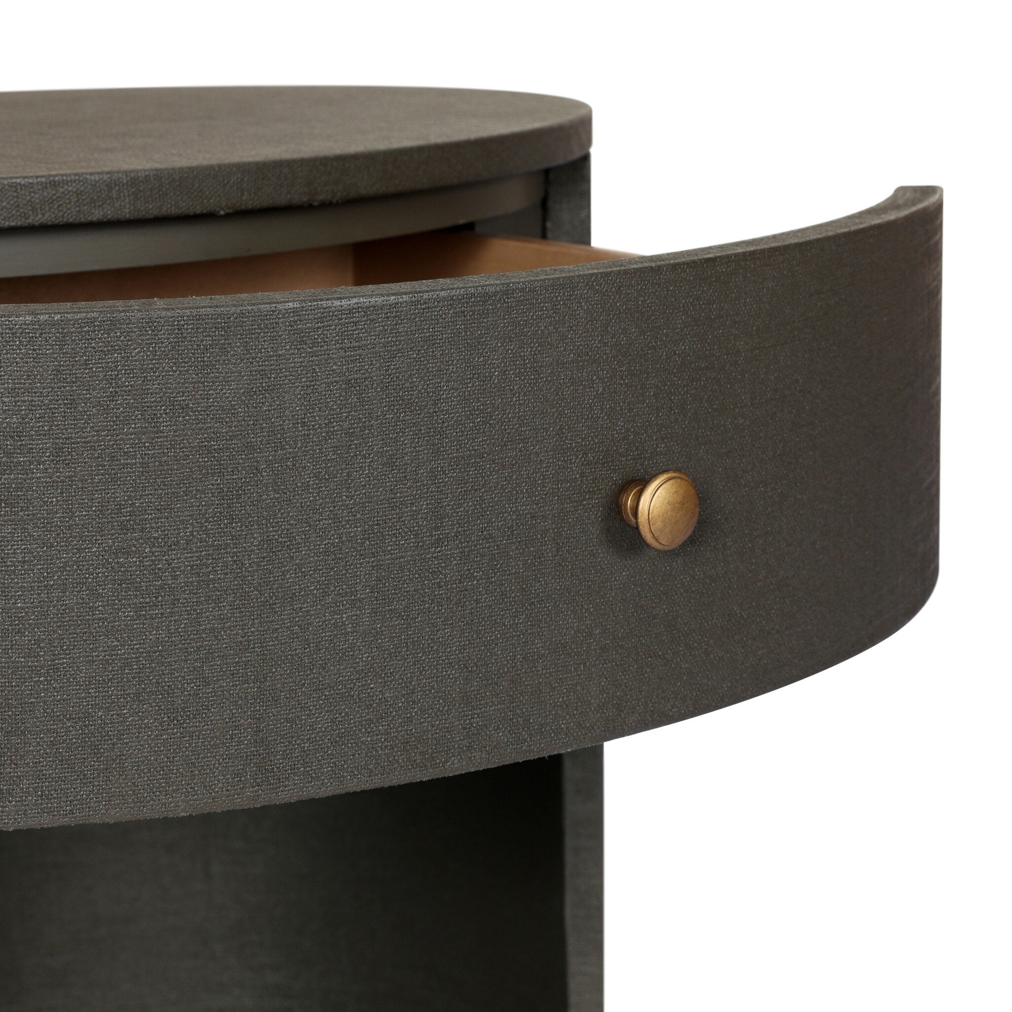 Crafted from dark green-painted linen, the Amelia Oval One Drawer Nightstand brings both style and function to your bedroom. Its gracefully curved silhouette features a single drawer paired with an open cubby, offering plenty of space to keep your essentials within arm's reach. The soft, supportive design complements any décor while providing the practical storage you need for a restful bedside experience.