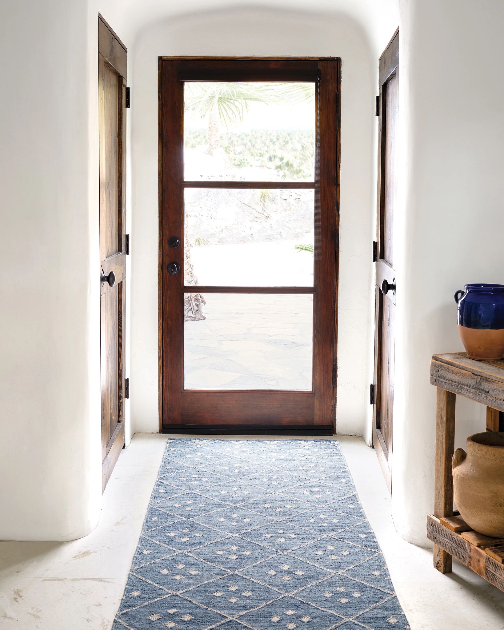 Our Kota Handwoven Wool Rug has a bold, geometric pattern and a subtle, metallic silver thread woven throughout its indigo base. This rug is low-profile and durable, perfect for homes with kids and pets and high-traffic spaces, like hallways and living rooms.