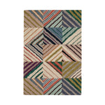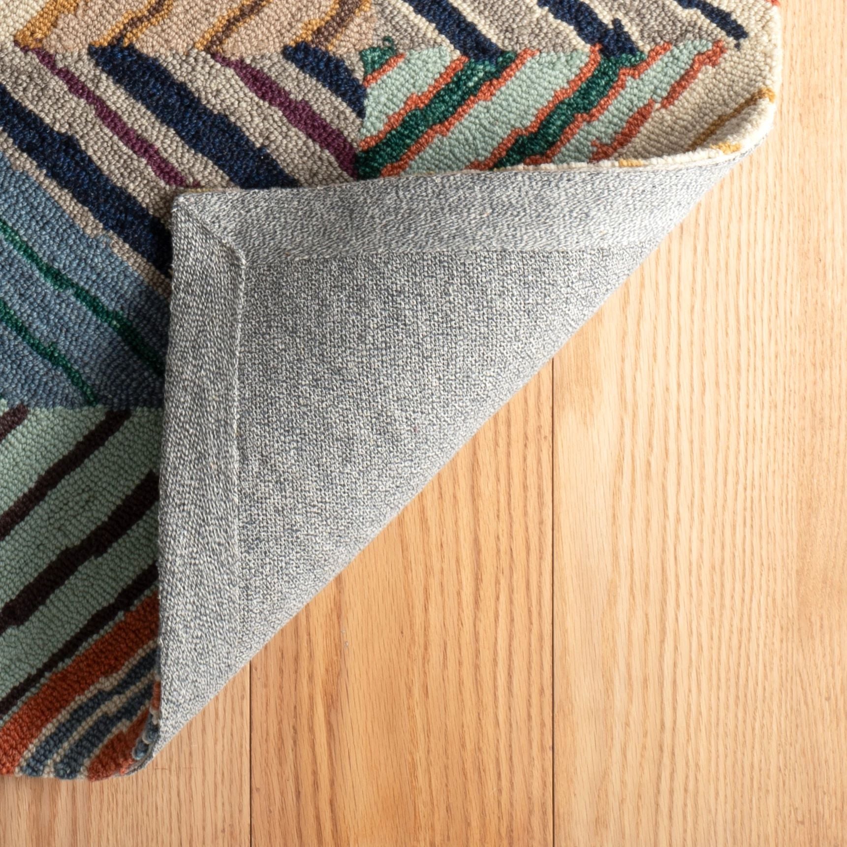 Hand micro-hooked wool rug featuring a patchwork design with muted tones and ticking stripes. Crafted from 100% wool with the durability and texture of artisanal construction, inspired by European hand-painted artwork.