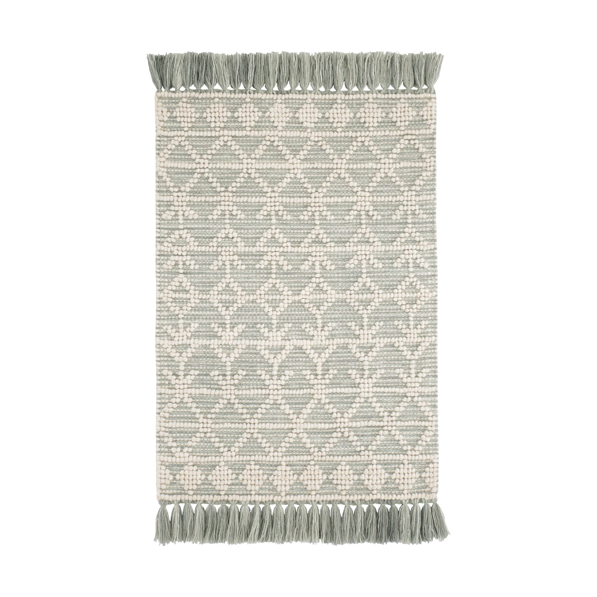 Handwoven wool rug featuring a Fair Isle-inspired pattern with raised ivory loops and flatwoven base. Durable, soft, and finished with classic knotted fringe.
