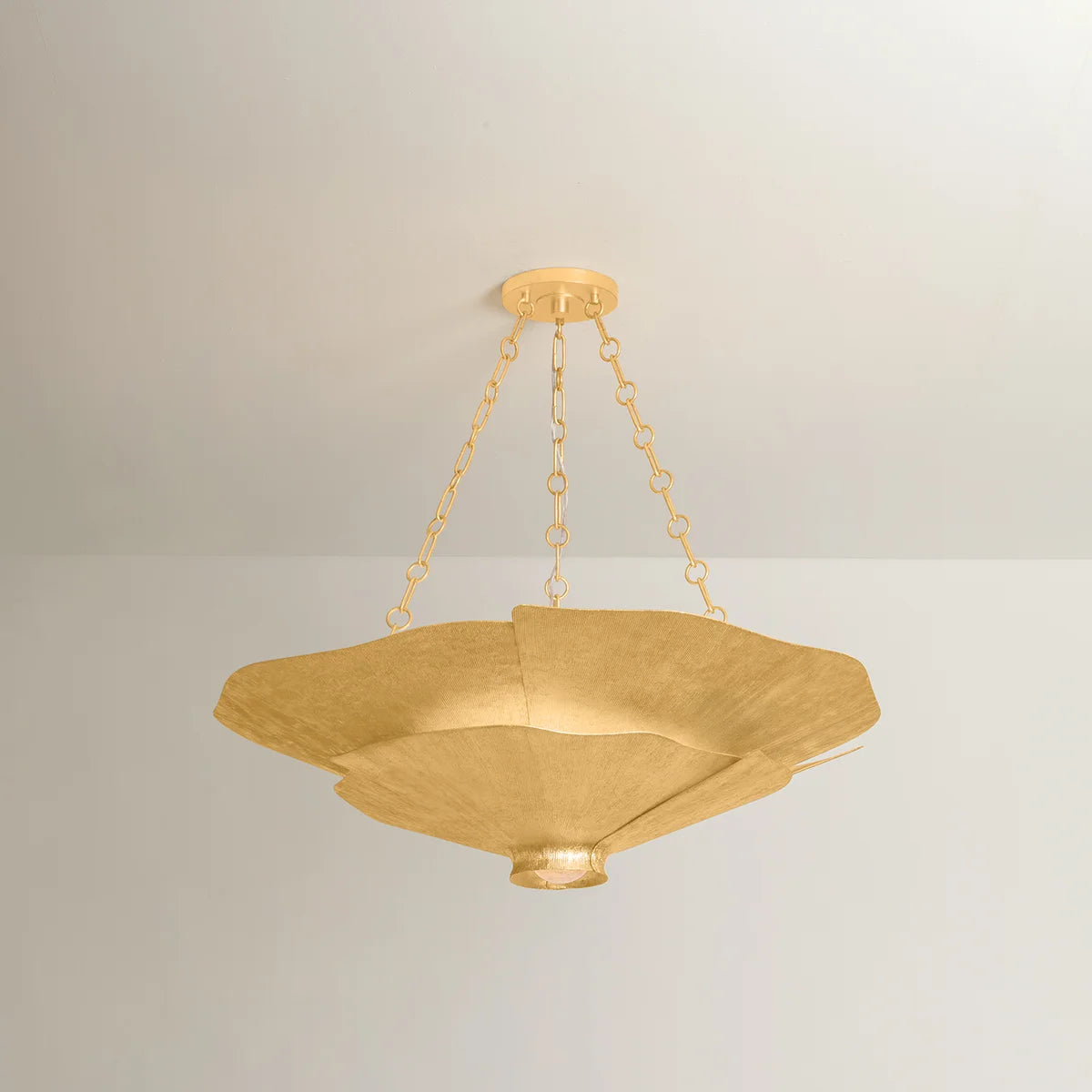 Der Kronleuchter Spring Valley besticht durch sein modernes florales Design mit zwei Lagen kunstvoll gestalteter „Blütenblätter“ mit unregelmäßigen Kanten und authentischer, gerippter Struktur, die einen reichen, vielschichtigen Effekt erzeugen. Das Licht strahlt durch einen inneren, champagnerfarbenen Glasschirm mit Lufteinschlüssen und unterstreicht die Wärme und Eleganz der Vintage-Goldblatt-Oberfläche. Die beidseitige Beleuchtung verleiht jedem Raum Tiefe und Leuchtkraft. Erhältlich in einer kleinen 4-flammigen und einer großen 5-flammigen Ausführung, ist dieser Kronleuchter ein eindrucksvoller Blickfang.
