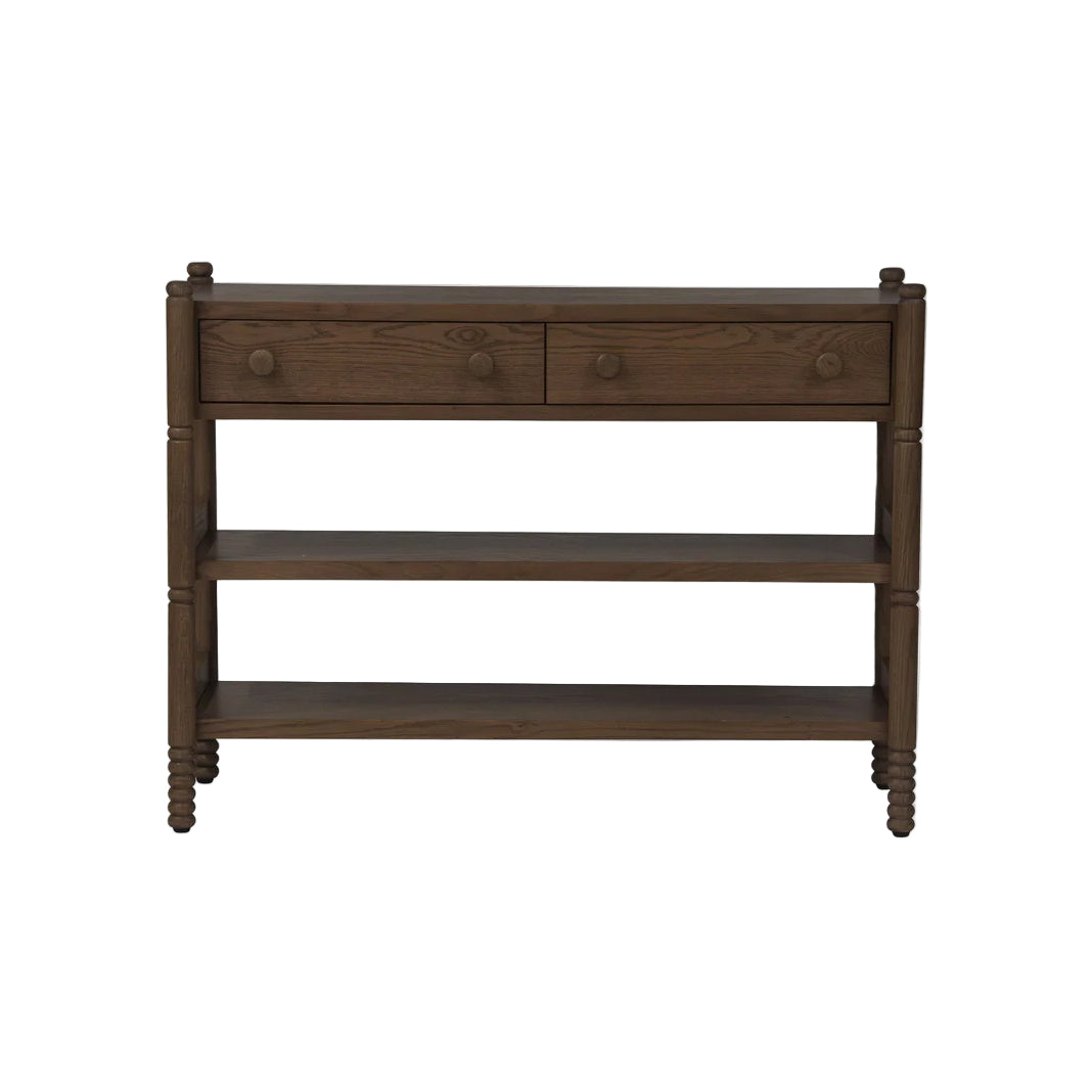 Der Konsolentisch Mylie aus Eiche besticht durch seine hochwertige Verarbeitung mit massiver Eichenkonstruktion und eleganten, gedrechselten Beinen. Dieses vielseitige Möbelstück, das sowohl Eingangsbereiche als auch Wohnräume harmonisch ergänzt, vereint die Wärme des Naturholzes mit dezenter Eleganz und bietet anspruchsvollen Hausbesitzern die perfekte Balance zwischen Form und Funktion.