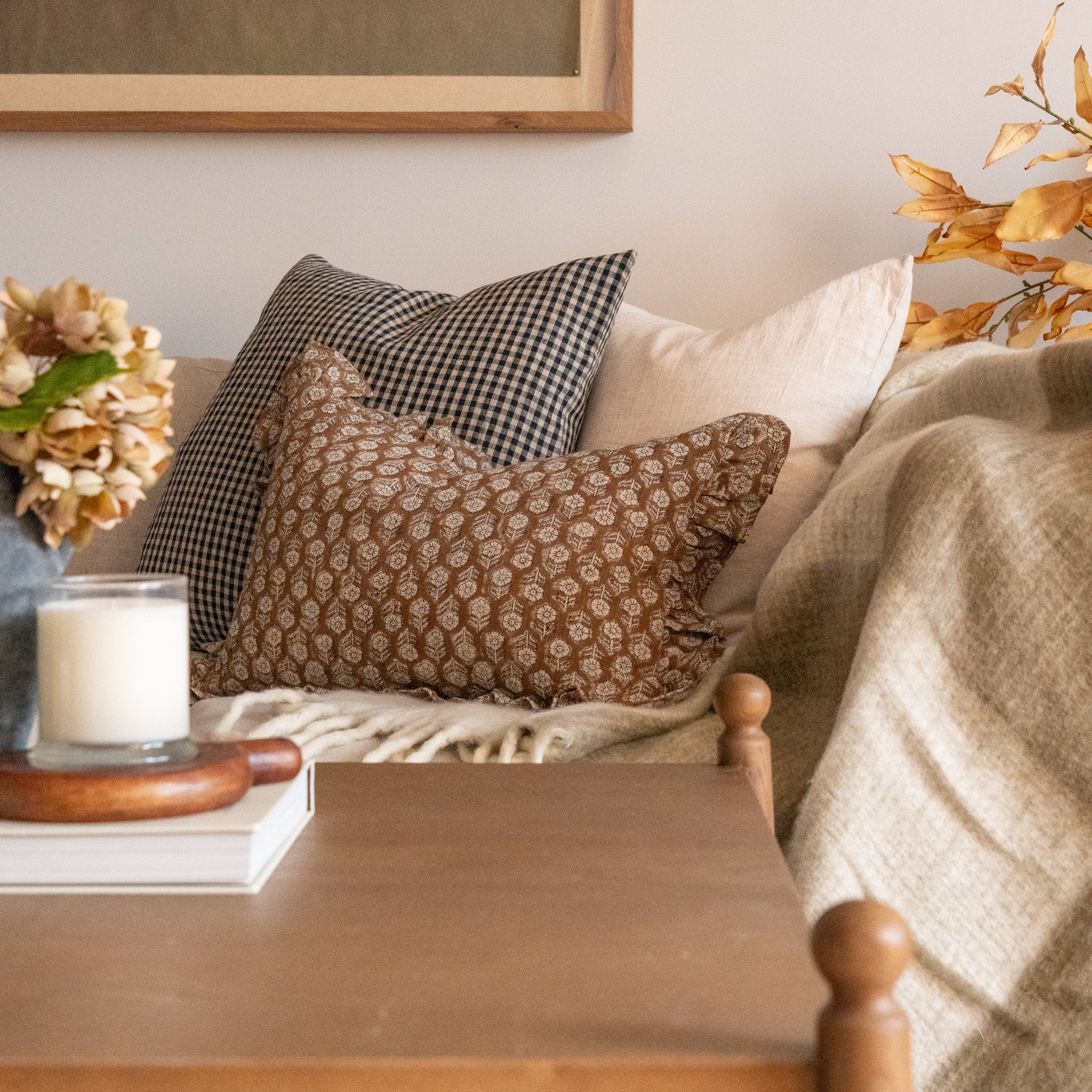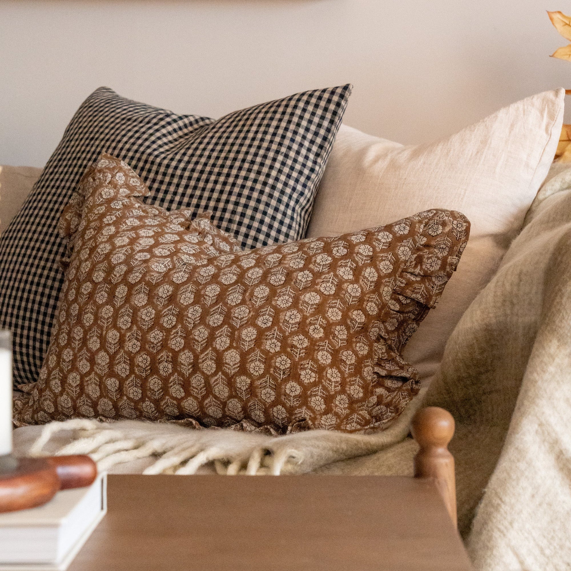 Verleihen Sie Ihrem Zuhause zeitlose Eleganz mit unserem Kissenbezug „Betsy“ mit Blockdruck und Rüschen. Der Bezug aus handbedrucktem Leinen besticht durch ein klassisches Blumenmuster und eine verspielte Rüsche, die jedem Raum eine feminine Note verleiht. Seine neutralen Farbtöne und der rustikale Charme schaffen eine besondere Atmosphäre.