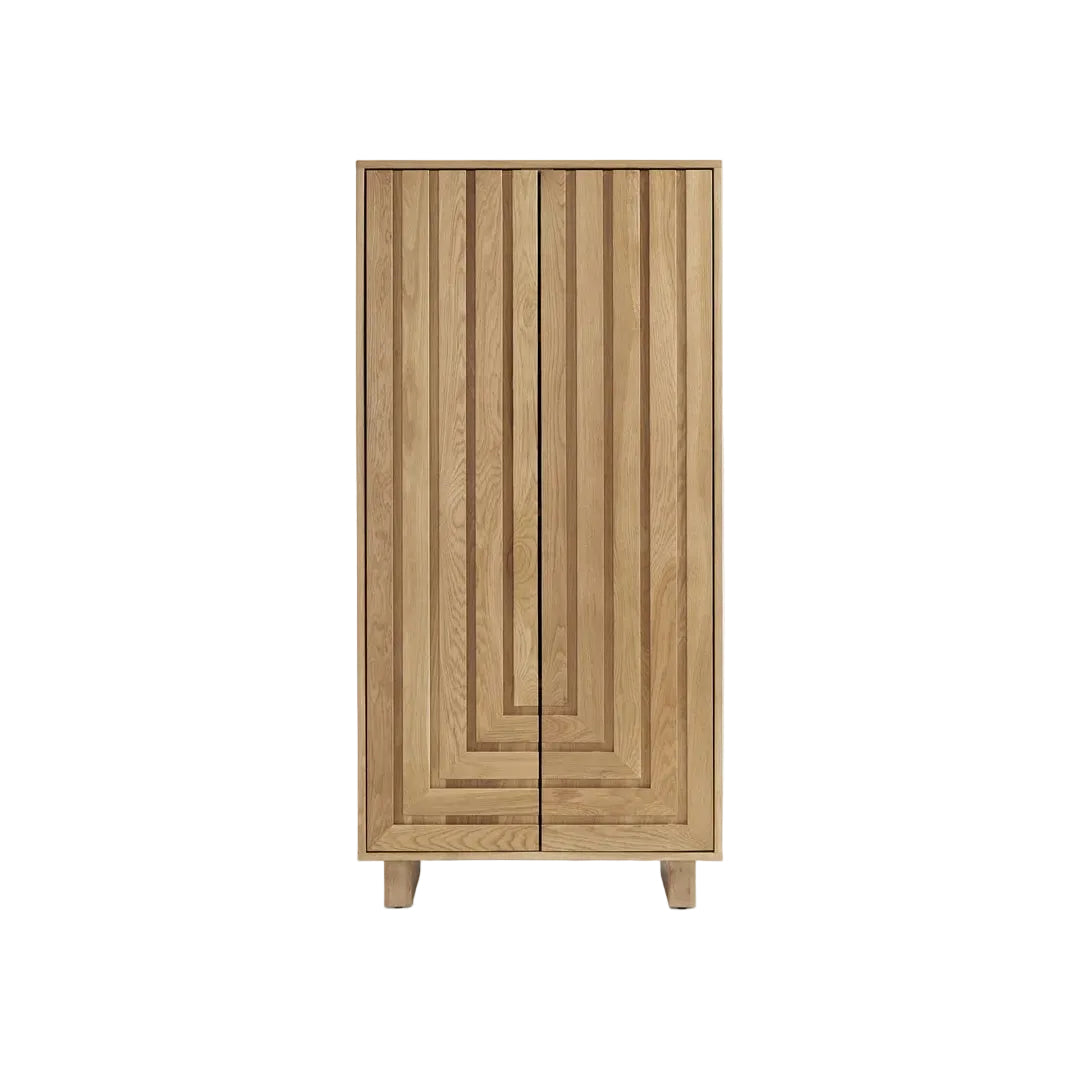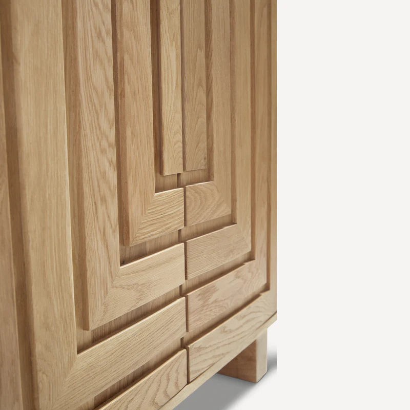 The Arraye Large Cabinet showcases the natural beauty of FSC-certified solid Oak through meticulously crafted geometric door patterns that command visual attention. Two doors open to reveal generous storage with three adjustable shelves, making this architectural statement piece both functionally practical and aesthetically compelling for any interior setting.