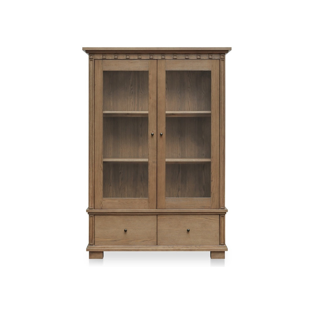 The Lillien Tall Cabinet offers smart storage in a beautifully crafted package. Made from solid ash wood with a warm brown finish, it features a glass-fronted upper section with removable linen drapes for flexible display options. Three adjustable shelves give you room to showcase items, while two roomy drawers below keep things organized and out of sight. Blackened bronze hardware and classic molding details complete the refined look.