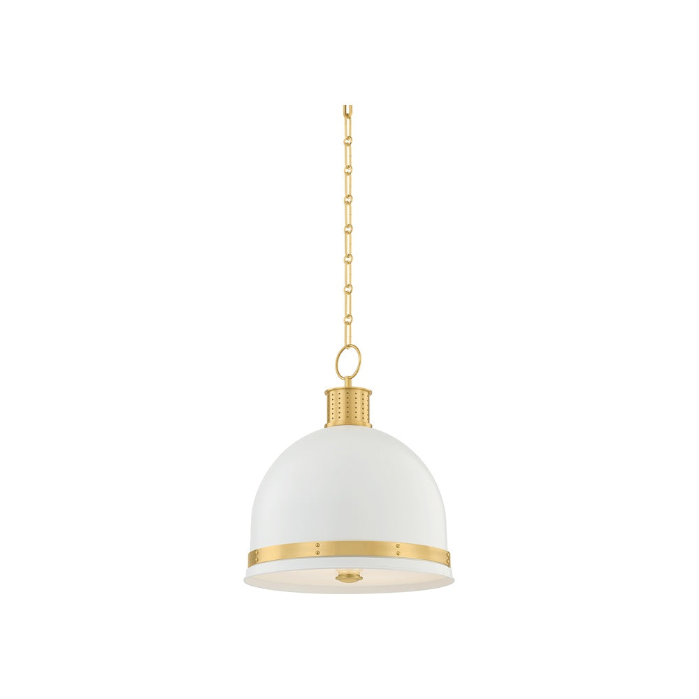 Elevate your space with the Briscoe Pendant, a contemporary take on industrial design. This striking fixture showcases a matte Soft White dome shade paired with a white glass diffuser, all suspended by an elegant Aged Brass chain and hardware. Machine-cut perforations and decorative studs create visual interest and depth, while the refined finish adds sophistication to any room. Perfect for kitchens, dining areas, and entryways, the Briscoe brings warmth and personality to your home with timeless style.