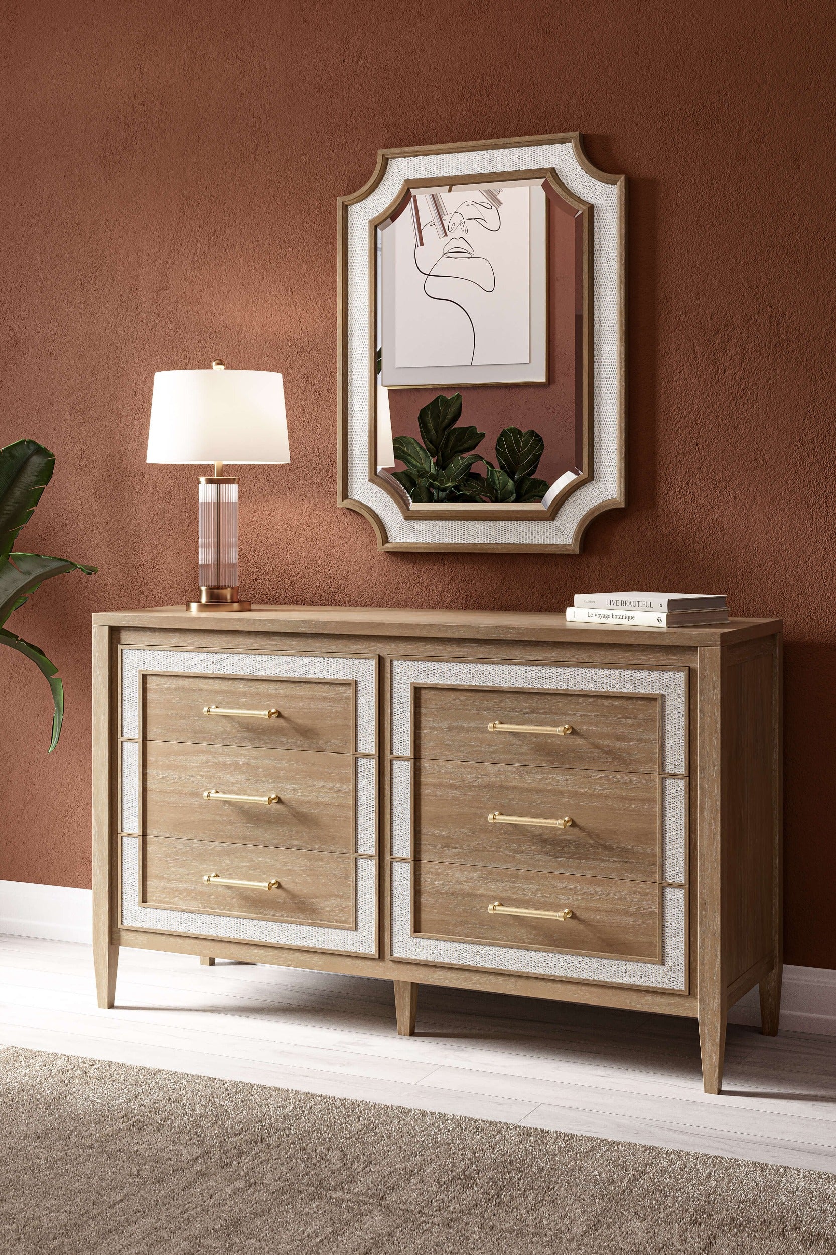 The Finsburg Mirror features a mahogany frame accented with natural rattan, combining sturdy craftsmanship with textural detail. Designed as a wall mirror, it offers both functionality and an elegant aesthetic that enhances any room’s decor.