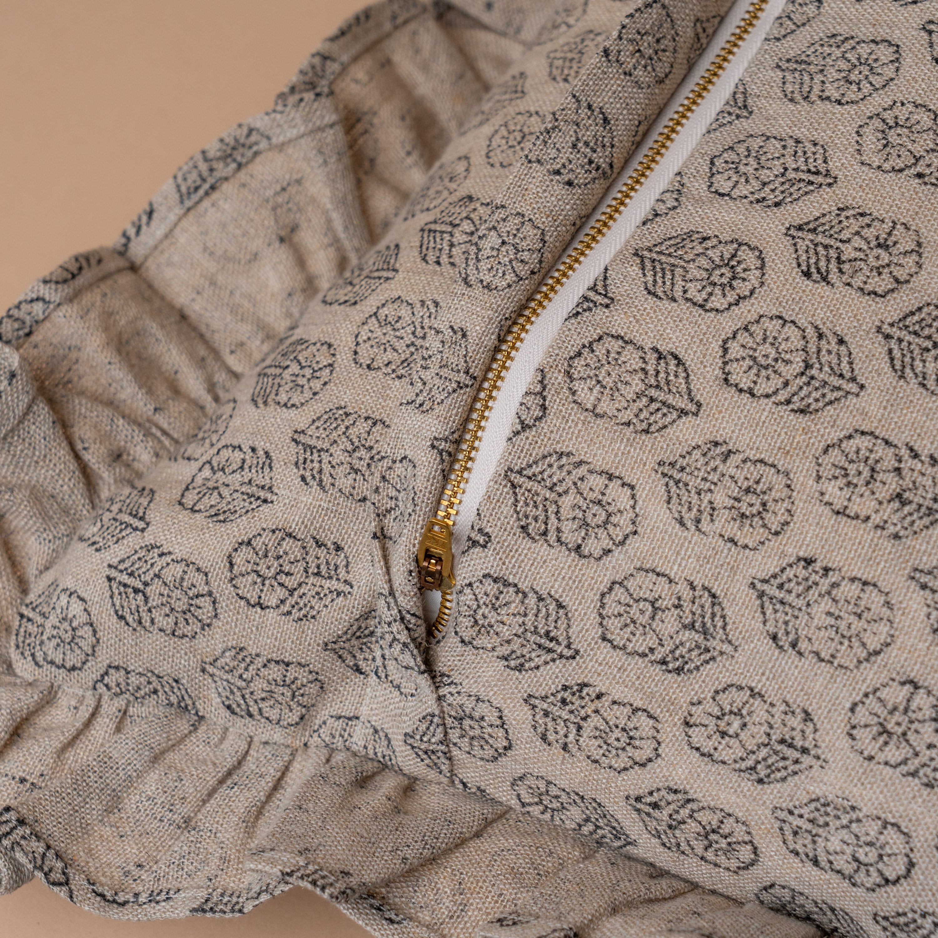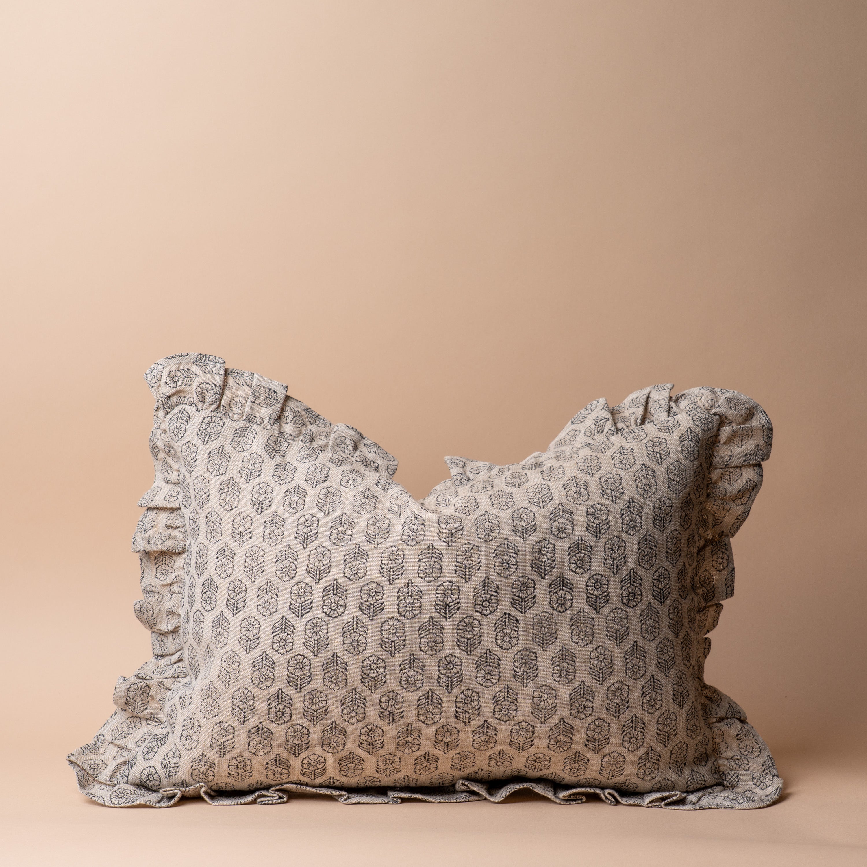 Bring a timeless charm to your home decor with our Dolly Block Print Ruffle Pillow Cover. Crafted from hand block printed linen, this cover features a classic floral print with a fluttering ruffle that adds a feminine touch to any room. Its neutral tones and rustic charm add character to any space.