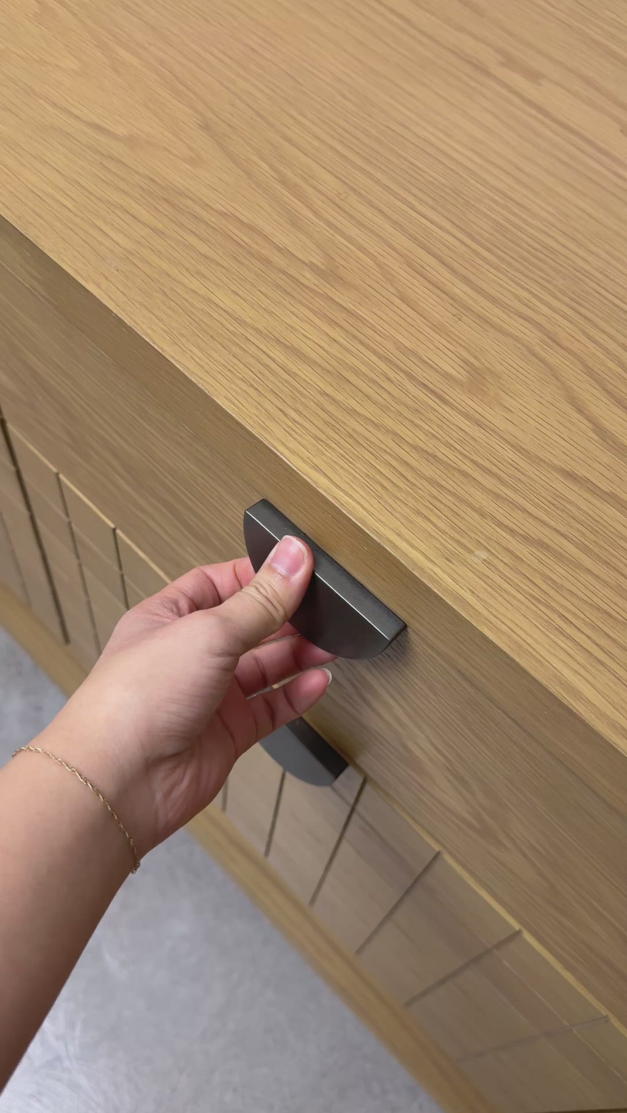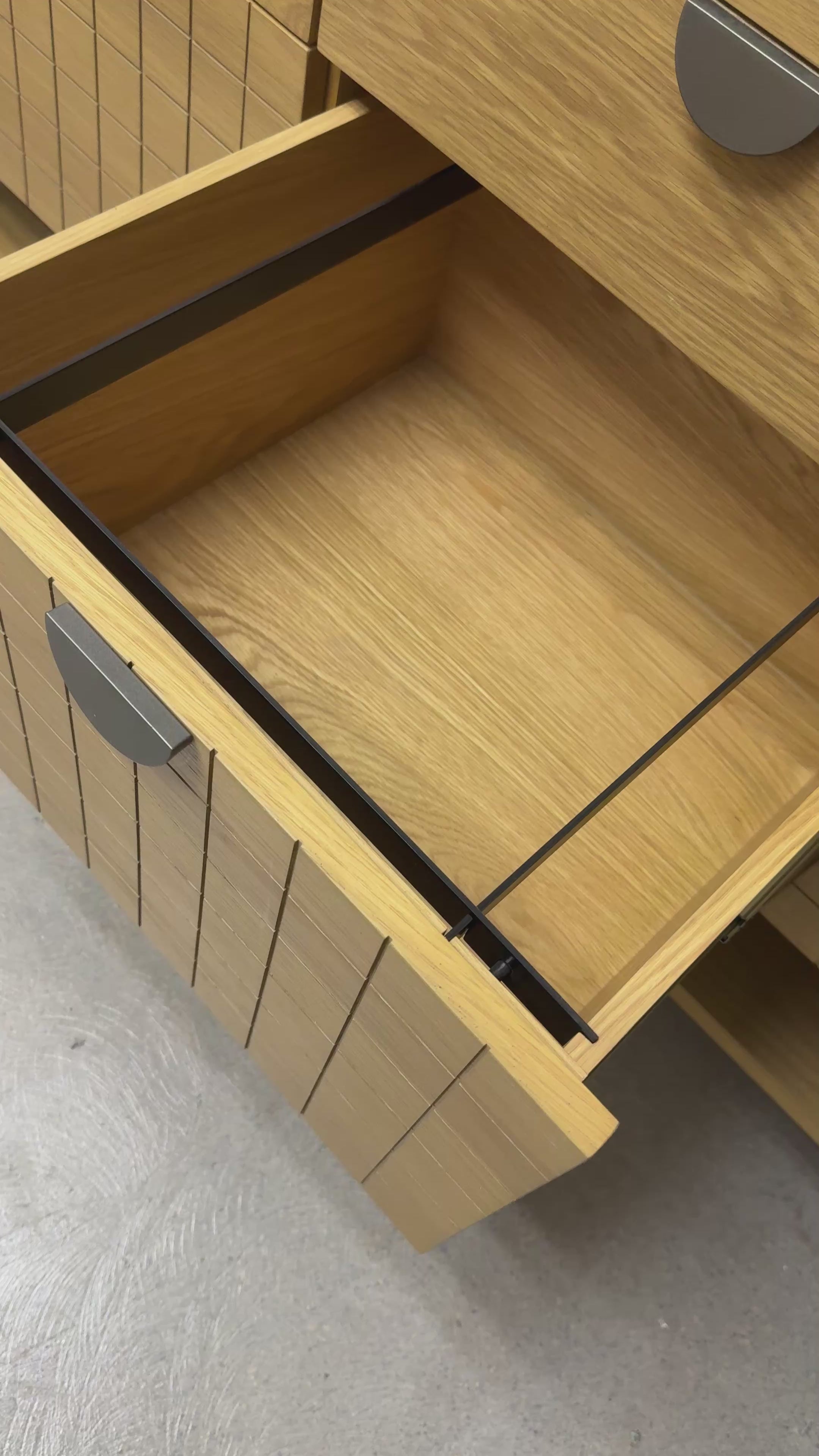 - this is a seventies inspired filing credenza with unique geometric grid pattern & half moon iron hardware