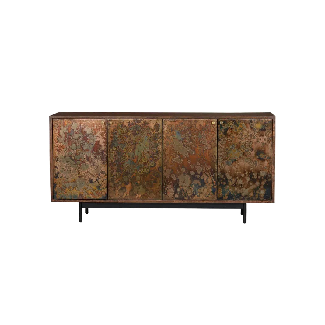 The Modo Sideboard merges sustainable materials with industrial refinement, featuring a Plantation Grown Acacia case elevated on a powder-coated steel leg frame. Four hinged doors finished in reactive metal detailing provide access to two adjustable shelves, creating a versatile storage solution that seamlessly bridges natural warmth with contemporary metallic accents.