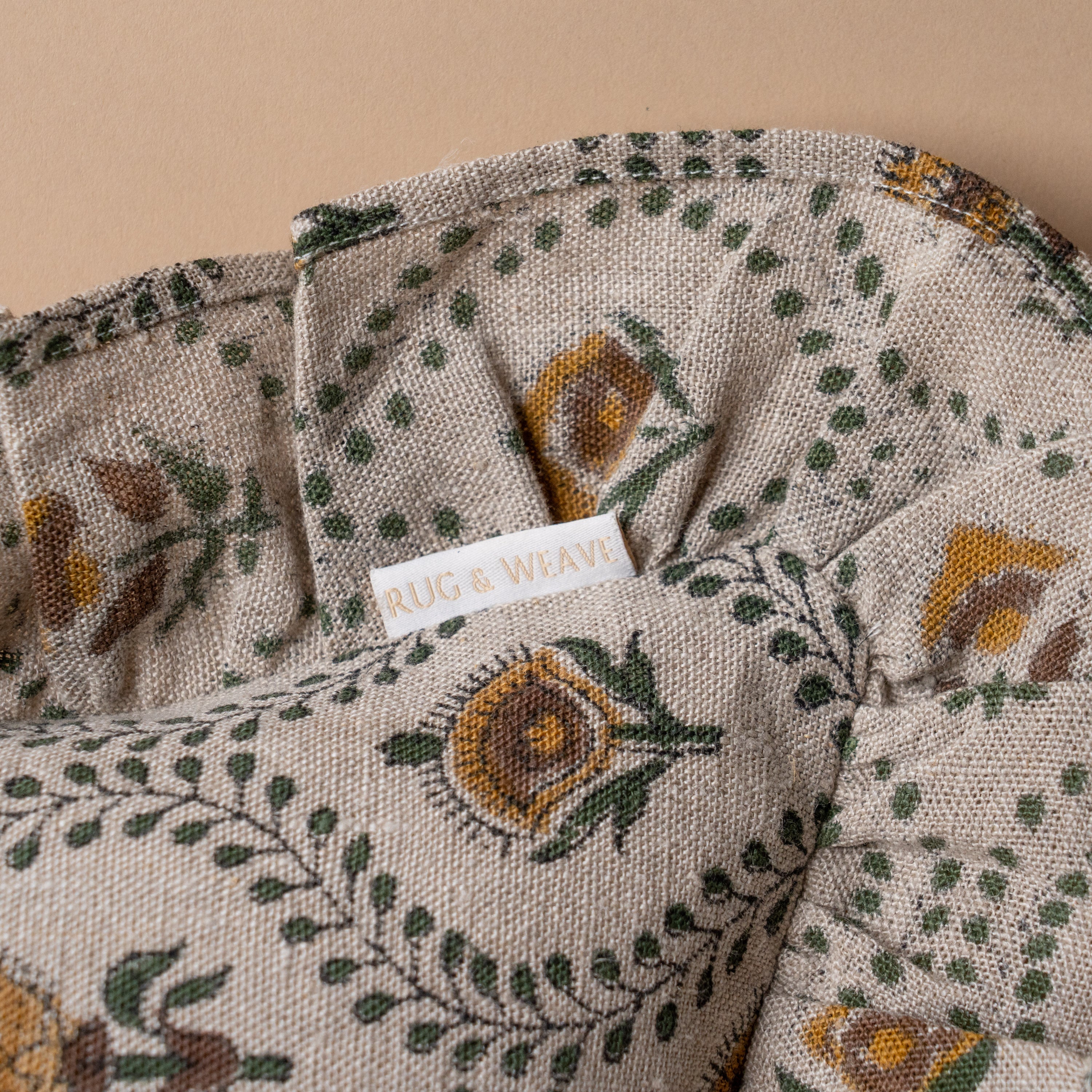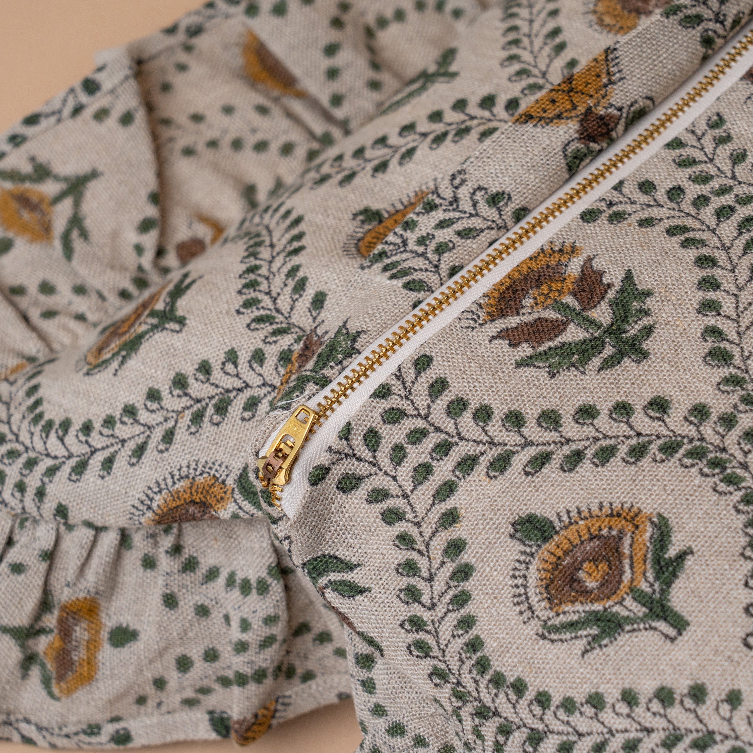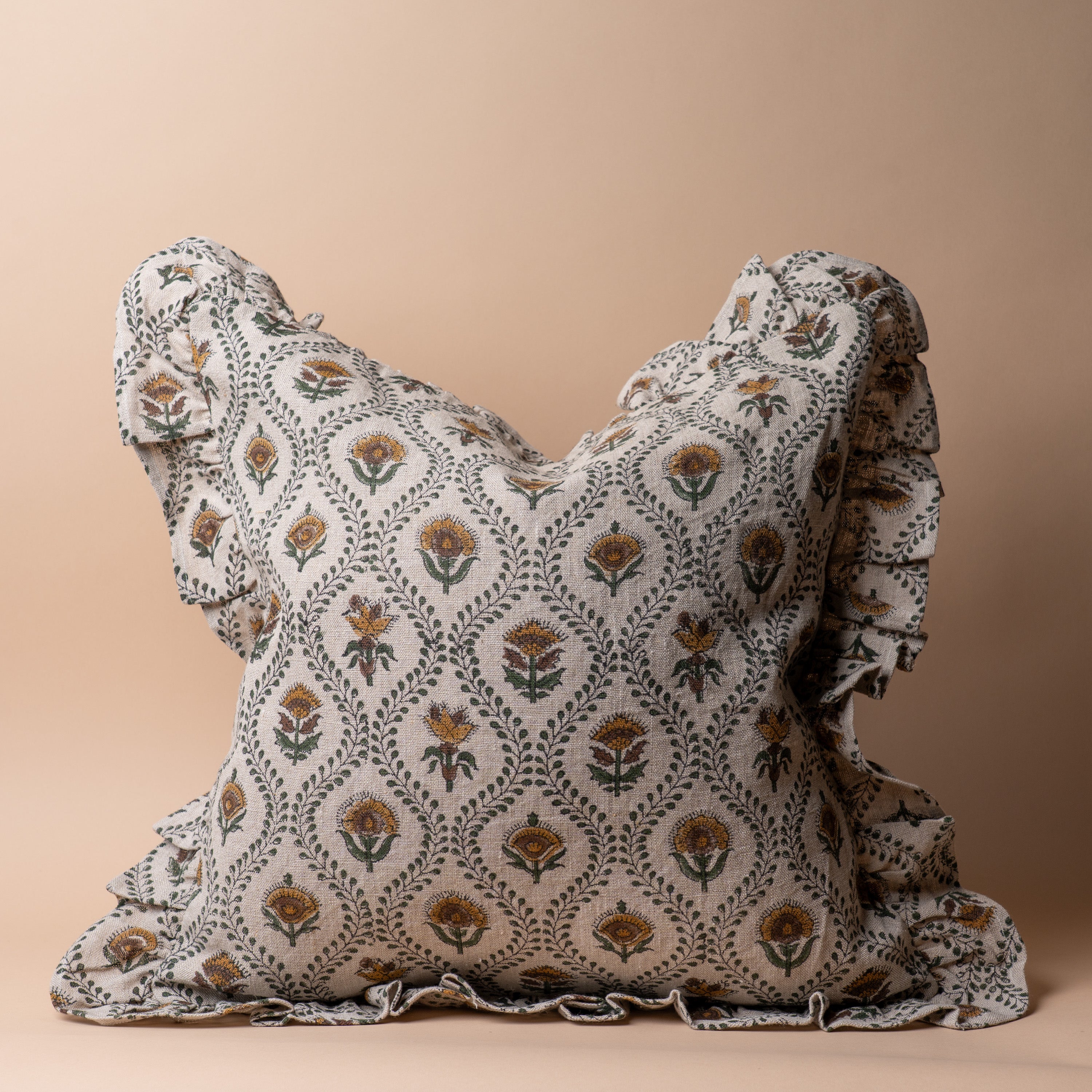 Meet our Noreen Ruffle! We felt it was time to introduce a ruffle in our best selling block print! Double sided and surrounded by a soft ruffle border, this linen covers is sure to be a conversation starter! Hand block printed on a rustic linen, these pillow covers are truly works of art.