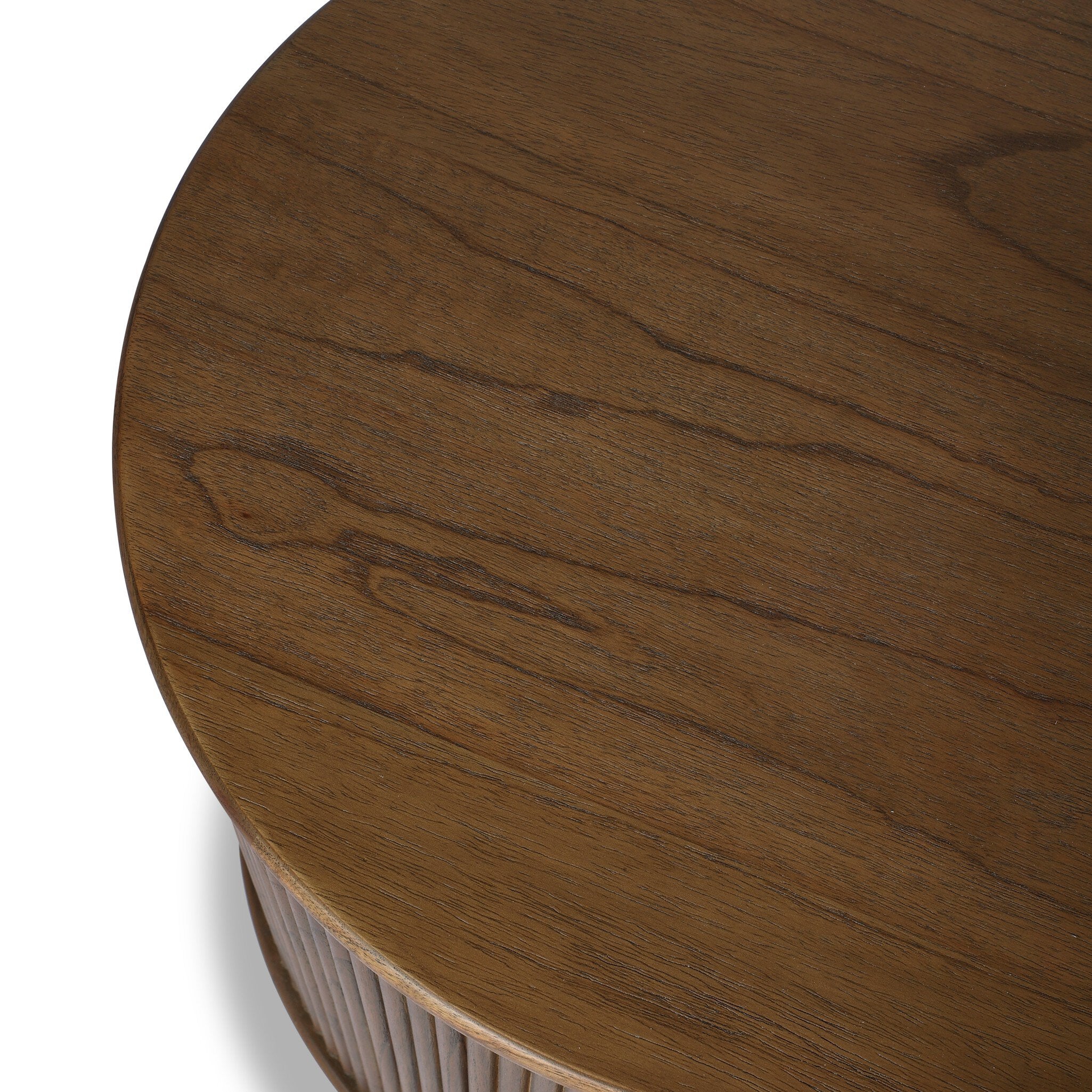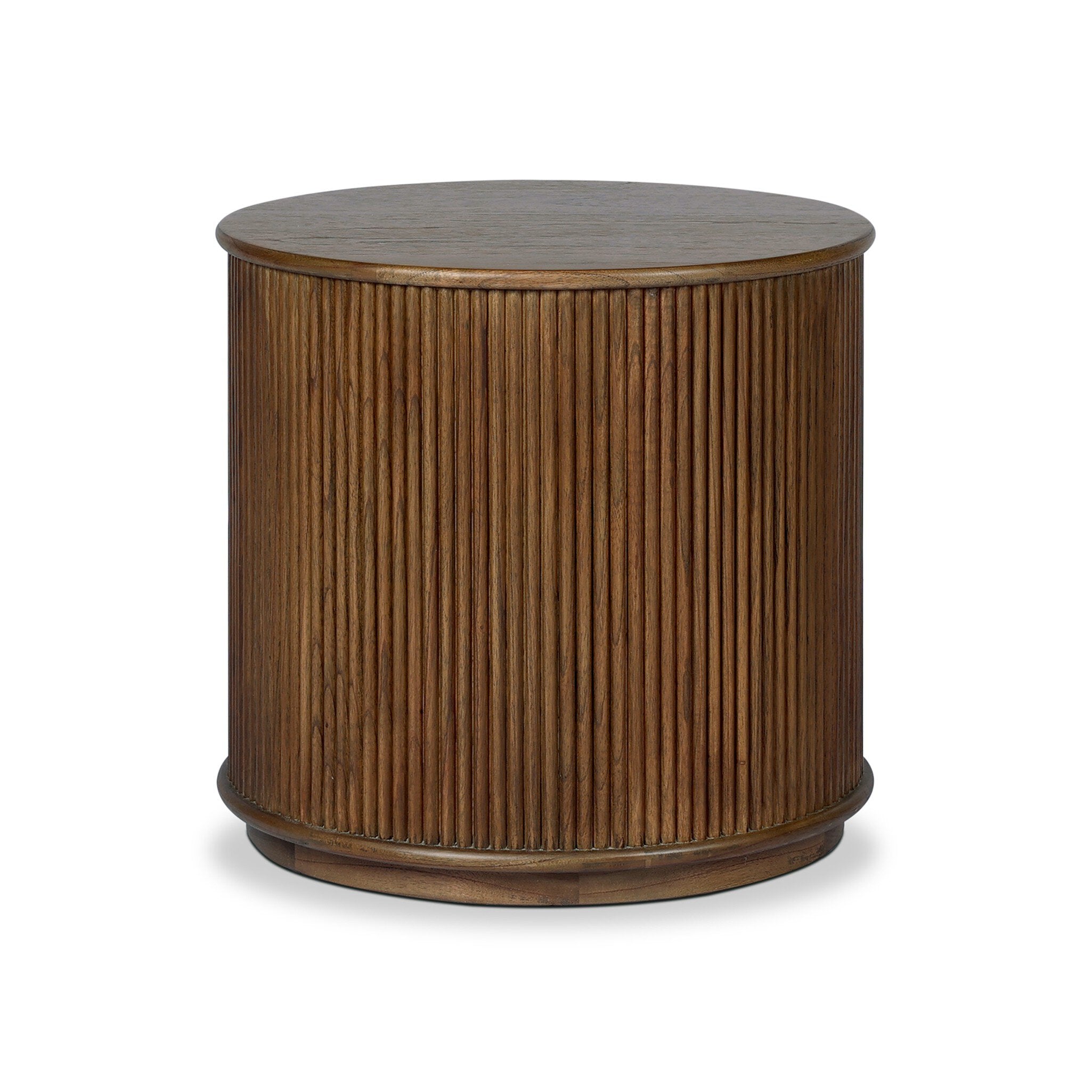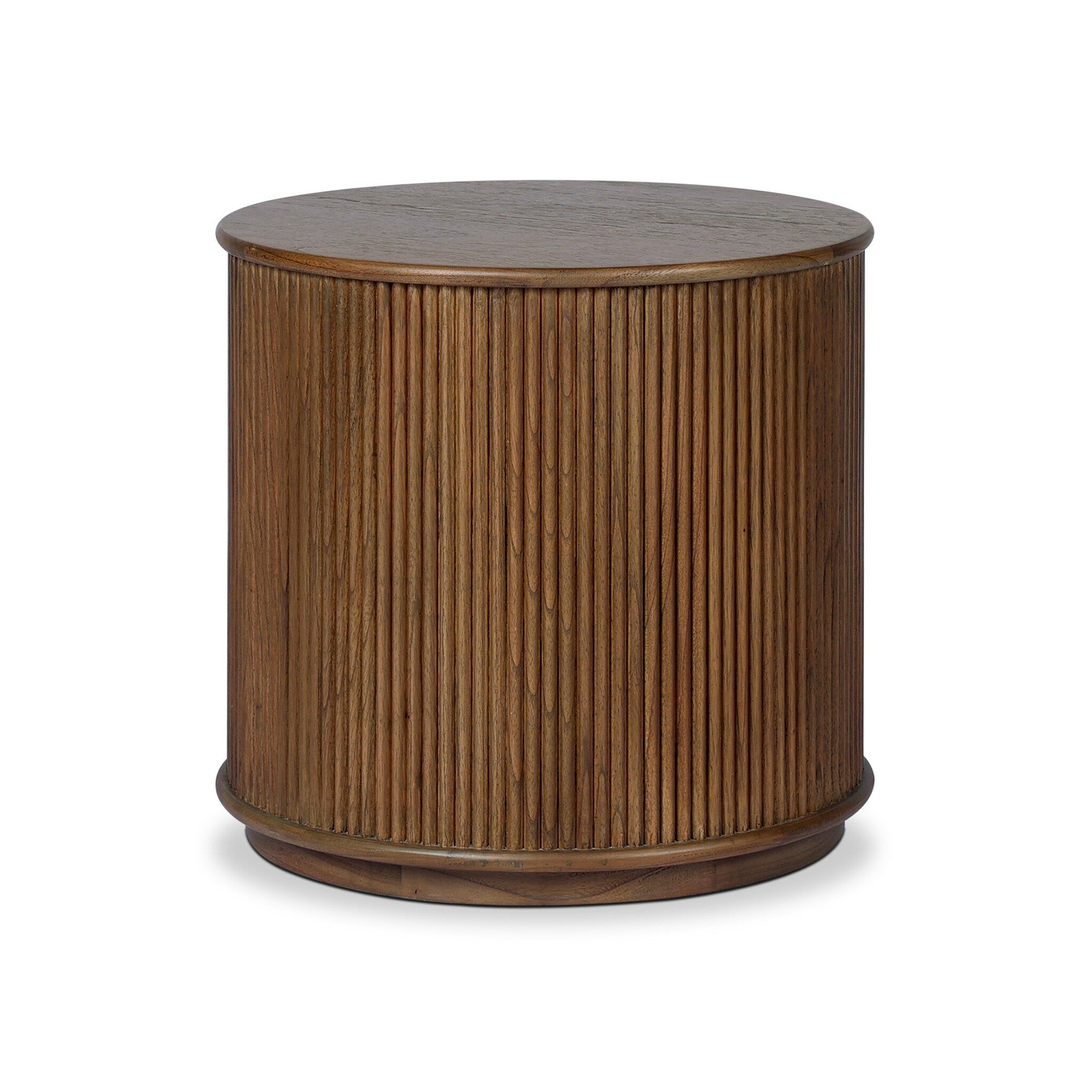 The Ona End Table showcases handcrafted detail with its carved reeding pattern that wraps the entire surface. Built from warm mindi wood with a sturdy plinth base, it brings tactile interest and artisanal charm to any room. This approachable yet refined piece works equally well beside a sofa or in a bedroom, adding character wherever it's placed.