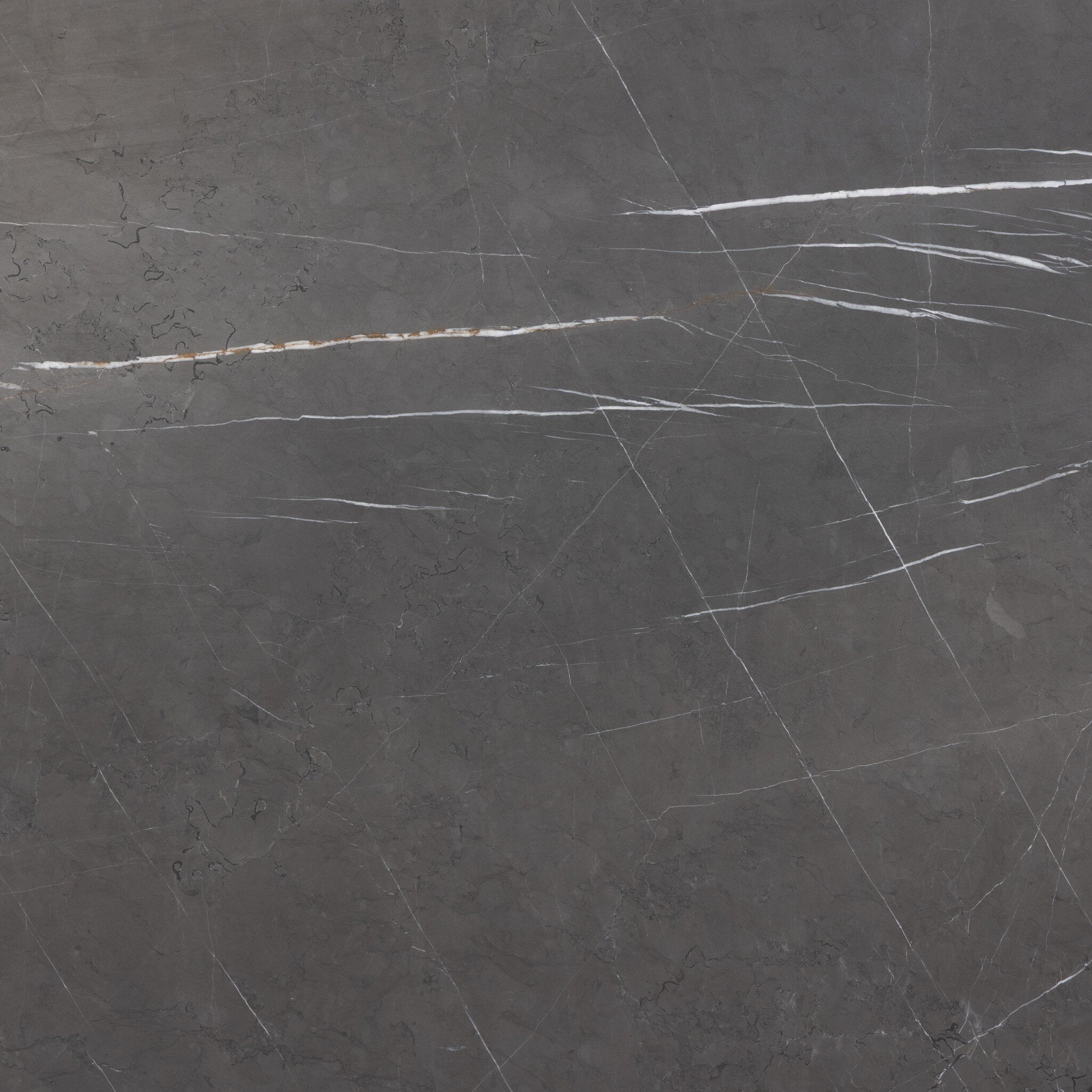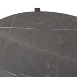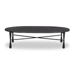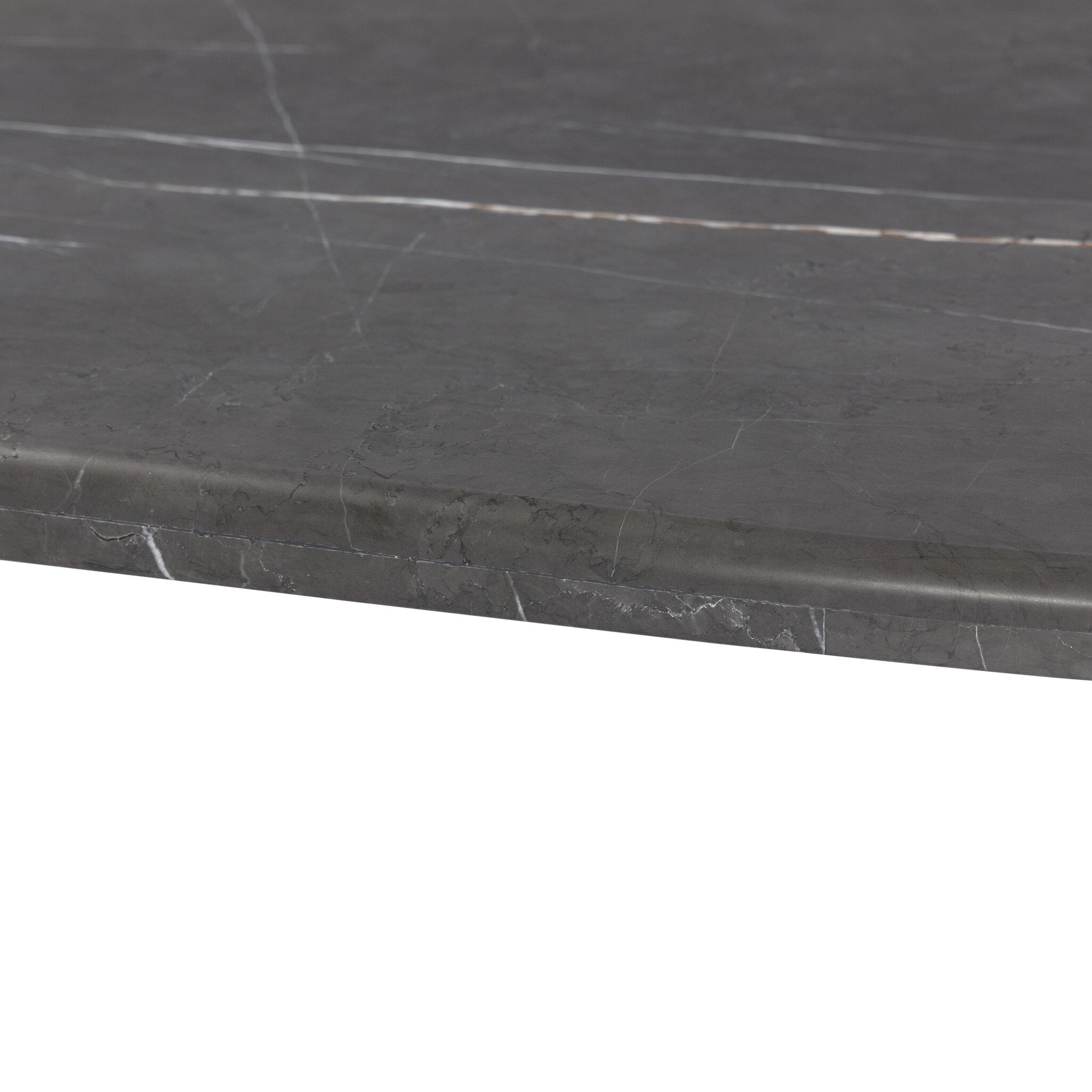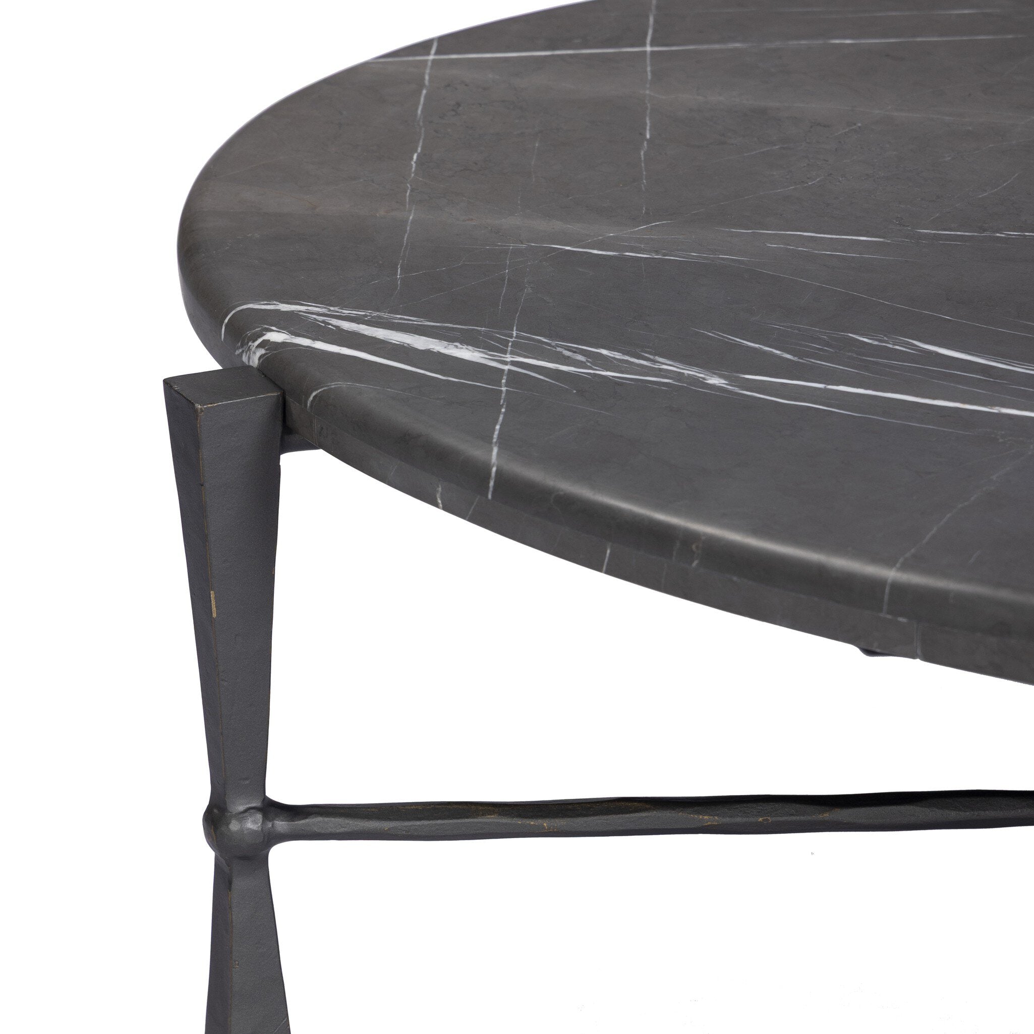 The Rayna Coffee Table pairs luxurious materials with thoughtful design. A sleek grey Italian marble top rests on an elegant bronze-finished iron base, where squared hourglass legs and centered ball details create visual lightness despite the substantial materials. This sophisticated blend of stone and metal brings understated glamour to any living room.
