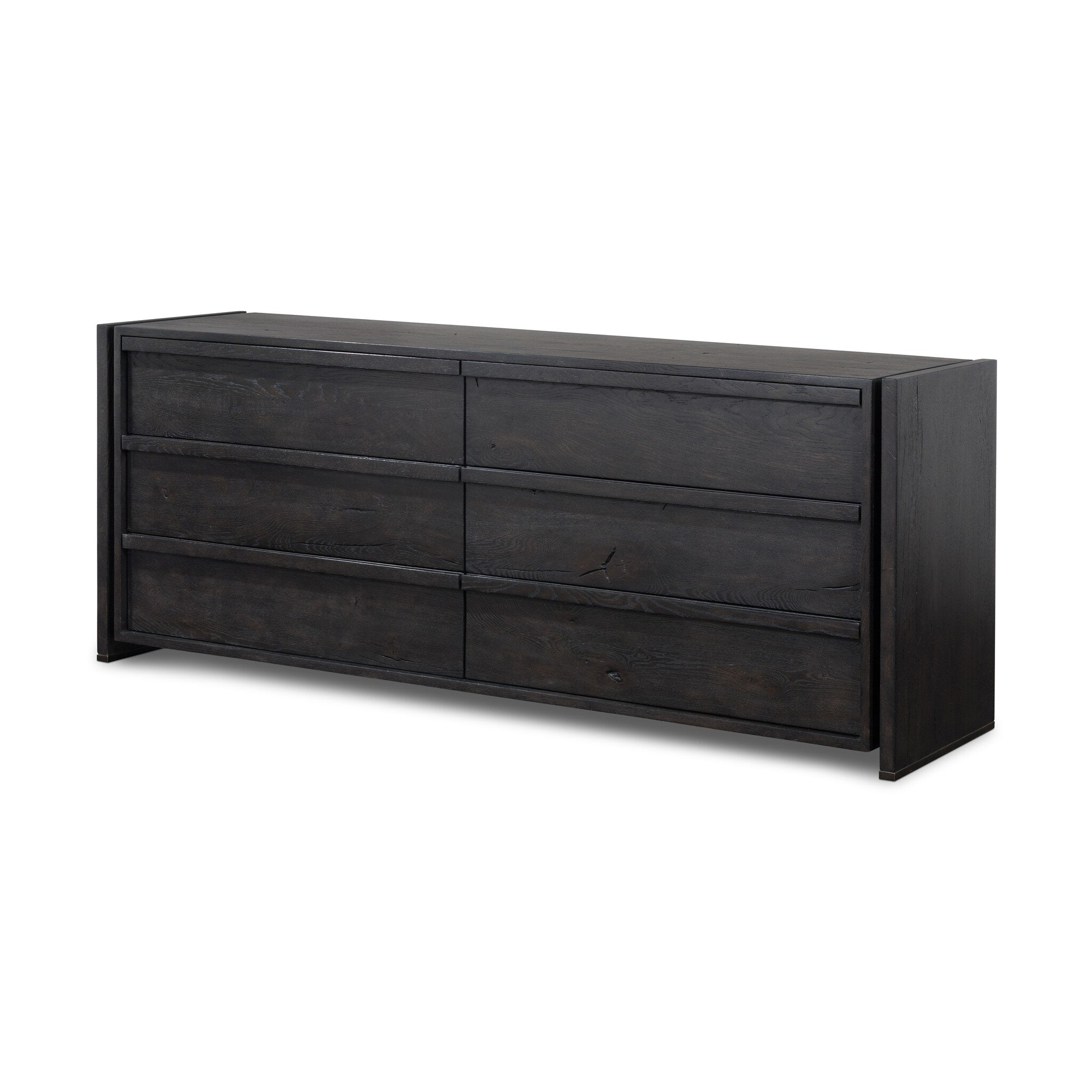 Crafted in a blend of modern minimalist and Brazilian styles, the Alora Dresser is designed by Thomas Bina and Ronald Sasson. The extra-wide dresser is made from natural reclaimed French oak, featuring a beautiful dark espresso finish with relief details and natural cracking and movement along the drawer fronts. Smooth-gliding drawers provide ample storage space and are fully finished on the interior.