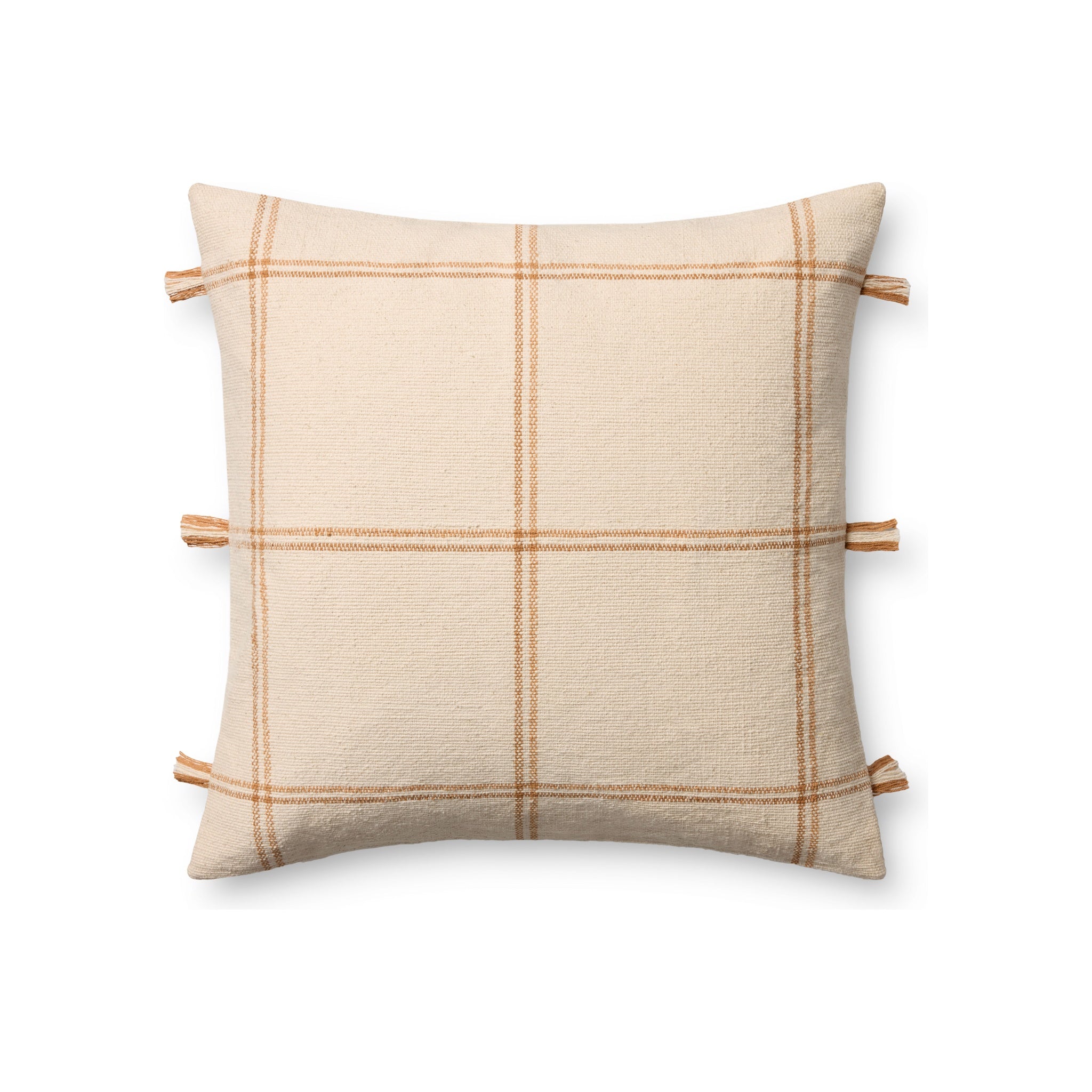Bring warmth and texture to any room with this hand-woven cotton throw pillow, crafted through a collaboration between Amber Lewis and Loloi. The 24" x 24" design features a classic windowpane check pattern accented with charming tasseled trim that adds subtle movement and visual interest. Made in India using traditional weaving techniques, this versatile piece complements both timeless and contemporary interiors, making it an ideal choice for living spaces and bedrooms seeking understated elegance.