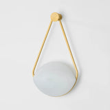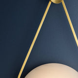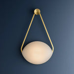 Inspired by the elegance of a drop earring, the ethereal Blaina sconce features a soft oval-shaped shade supported by an artistic triangular suspension. The swirls of the matte cloud glass shade are complemented by the warmth of the Aged Brass frame, highlighting a sense of cohesion between the materials. Dangling from a peg-like mount, Blaina makes a poetic statement.