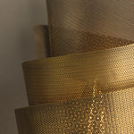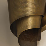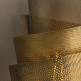The Blaisdell wall sconce evokes the look of rolled wire mesh, blending organic and mechanical elements. It features two sheets of finely perforated metal wrapped to form a dynamic cone shape. The intricate perforations provide texture and enable light to diffuse through the design. With its Patina Brass finish, the Blaisdell adds a sophisticated artistic touch to any space.