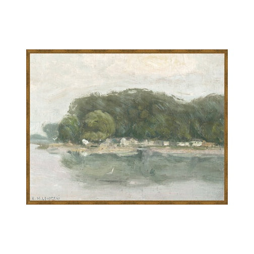 "Danube Reflections" is a framed linen-textured artwork featuring a vintage view of trees along the Danube River. Its textured surface adds depth, creating a calm and classic atmosphere perfect for enhancing any room.