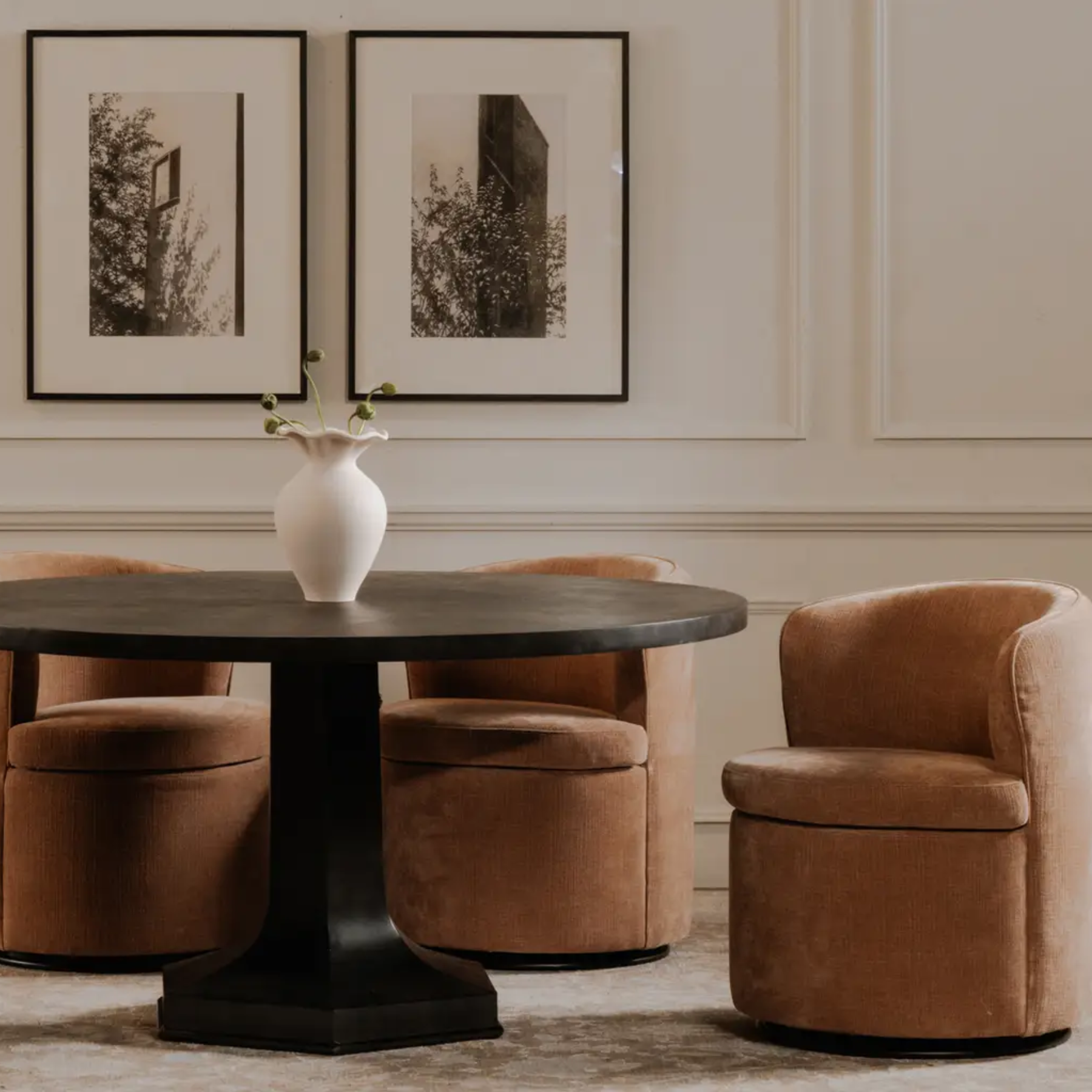 The Darlene Dining Chair features a soft pink hue and a gracefully curved shape that adds an elegant, eye-catching element to any dining space.