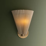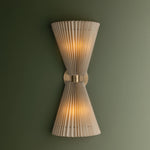 The Dell wall sconce balances softness with architectural form, drawing inspiration from vintage pleats and fan motifs. Offered in single or double light options, its faux silk shades are gently gathered by slender metal rods that pass through them, producing a natural, subtly uneven drape. The Patina Brass hardware enhances the antique character of this refined lighting fixture.