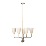 Elevate your space with our Elkie Chandelier. Graceful curves and aged brass arms bring traditional design to life while the soft, speckled cream shades diffuse ambient light for a warm, inviting glow. Perfect for adding texture and elegance to any room.