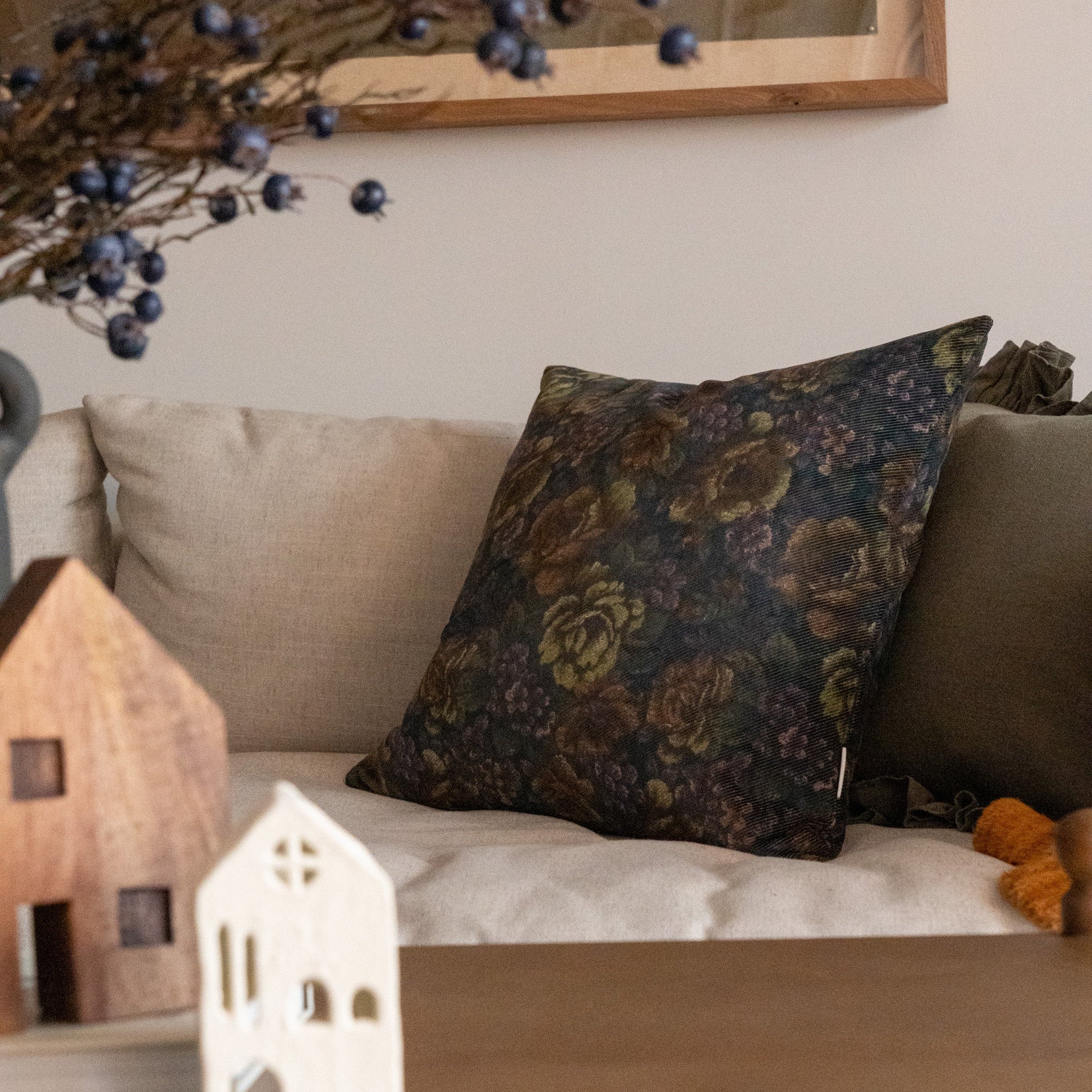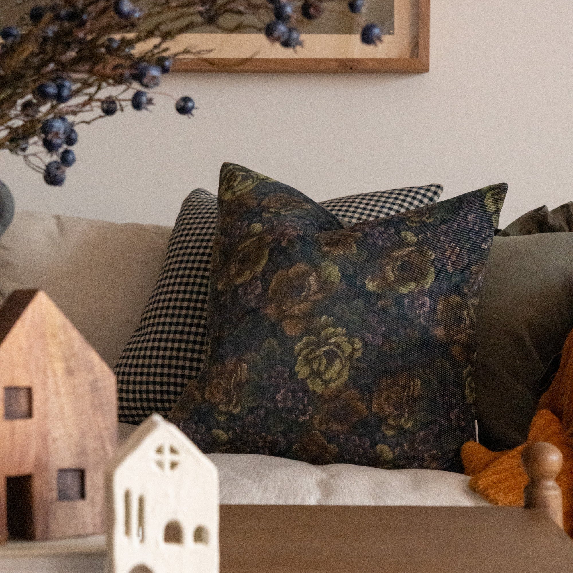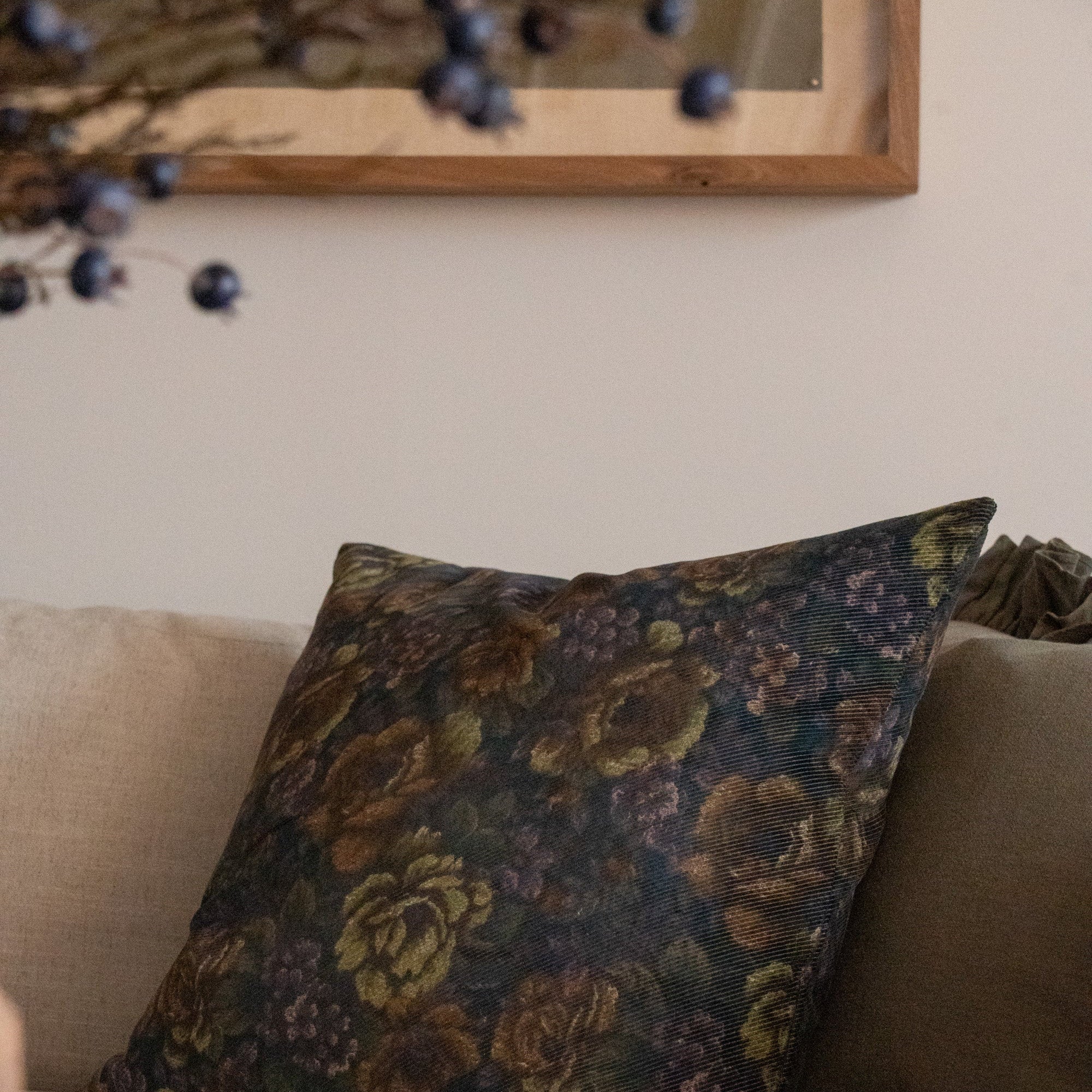 Our Estelle Pillow Cover showcases a moody floral motif on a dark background, printed in Japan. Tones of brown, plum and green all work together to create a vintage feel. Double sided for a truly luxurious feel, place this striking pillow anywhere you want to add some visual interest.