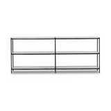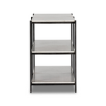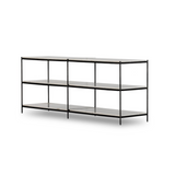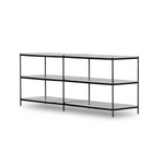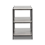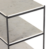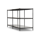 The Felix Console Table features a hammered grey-finished iron frame supporting three tiers of polished white marble. This design offers an open, airy aesthetic while providing ample surface space for display or storage, combining durability with refined elegance. Ideal for enhancing entryways or living areas with a sophisticated, functional statement piece.