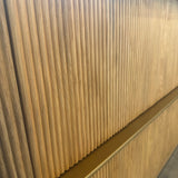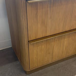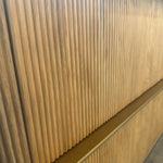 The Kaia Dresser harmoniously combines form and function. Boasting a rustic oak veneer with vertical reeding, the dresser is elevated by a gold steel base. Being a natural material, wood may have variations in texture, indentations, cracks, colour, grain, knots, and burls, adding unique character to each piece.