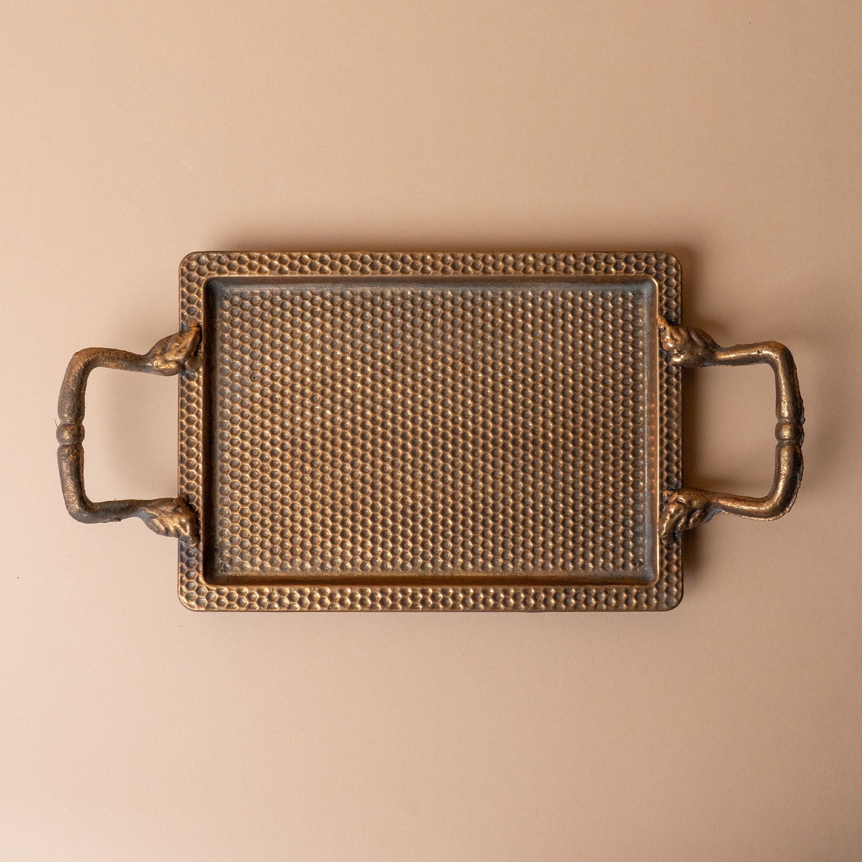 Elevate your serving game with this stunning Hammered Metal Tray, where artisanal craftsmanship meets everyday practicality. The warm gold finish catches the light beautifully, while sturdy cast iron handles make it easy to transport from kitchen to table. Whether you're hosting guests or organizing your space, this piece brings both elegance and functionality to any room.