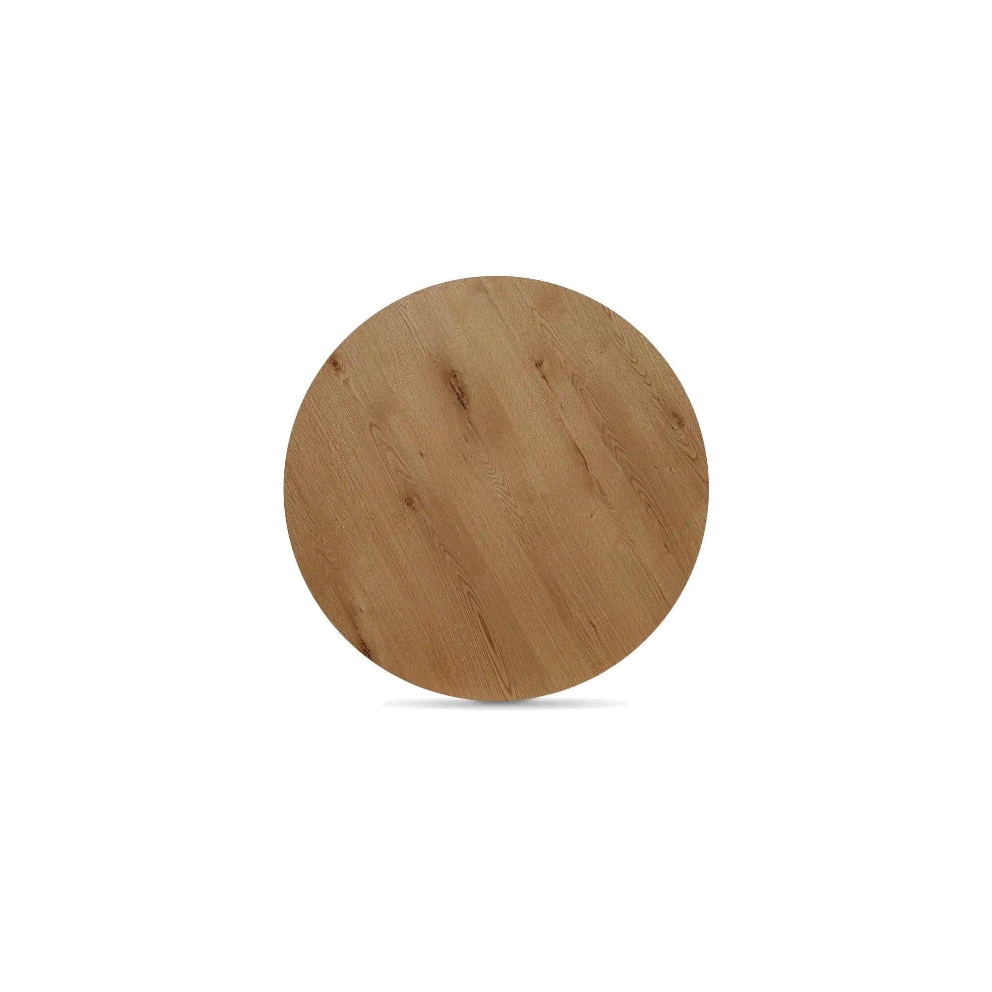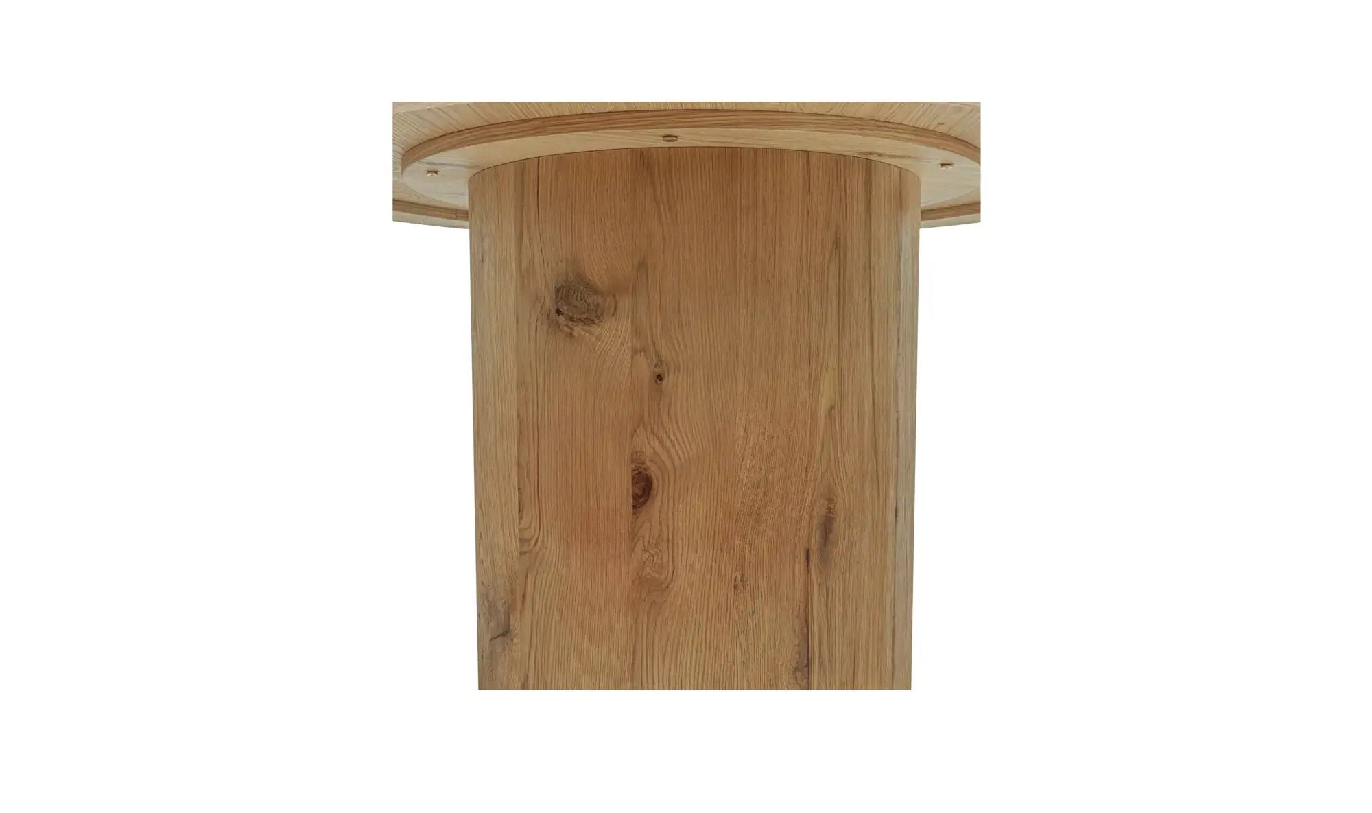 A round dining table with clean, modern design. The sturdy pedestal base supports a spacious top with a distinctive edge detail. Finished in rustic oak for warmth and character, it combines minimalist style with solid construction and timeless appeal.