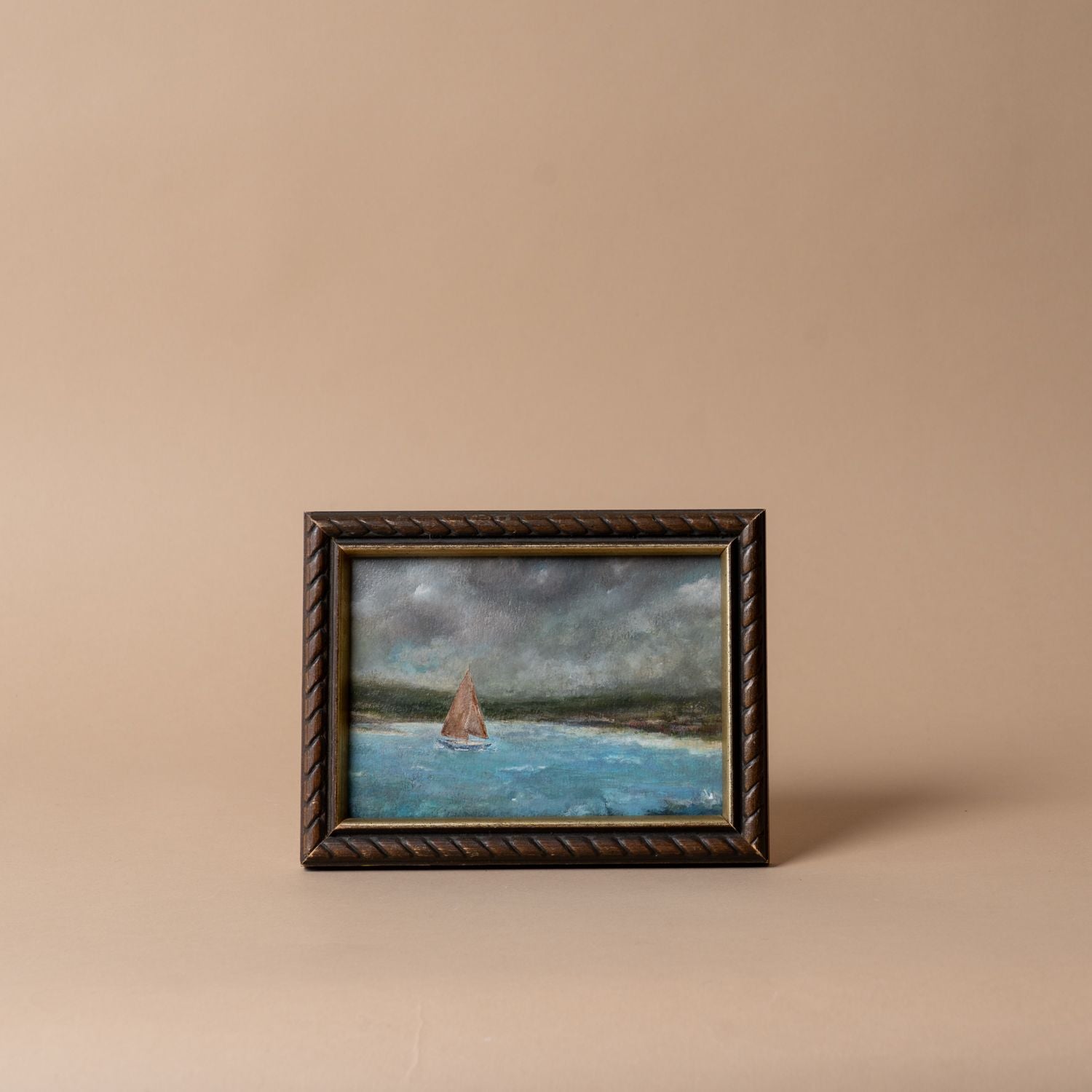 Experience serenity and nostalgia with 'Let's Sail Away' by Melissa Mary Jenkins. The textured brushwork and muted tones of teal, grey, and green bring subtle movement to the single sailboat on calm blue-green water under a cloudy sky. The vintage wood frame with a handcrafted walnut ink finish adds an old-world charm to this timeless piece.