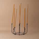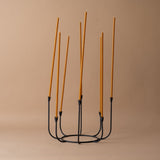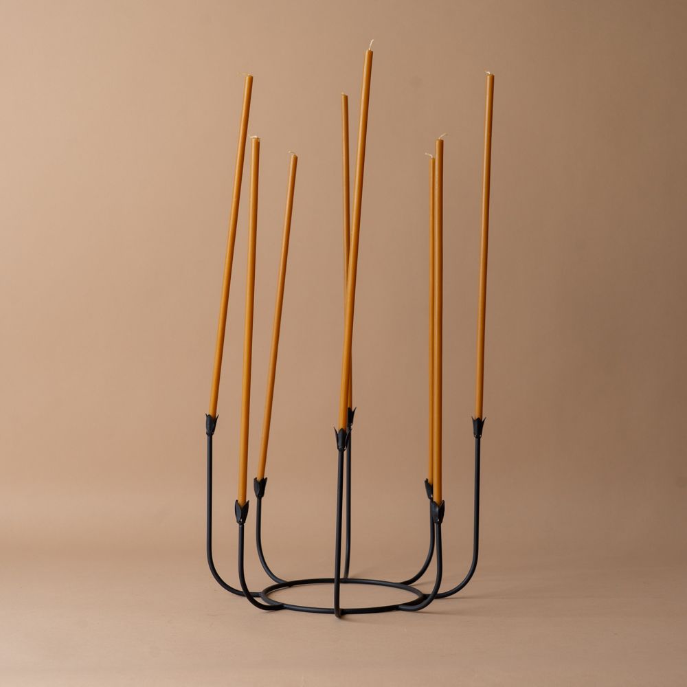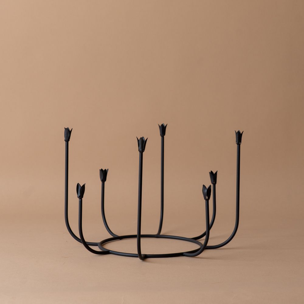 Inspired by wrought iron garden gates, this beautiful piece holds eight long stem taper candles, and boasts curved arms and tulip candle cups. This candelabra is entirely handmade using traditional methods‚ so unique features and imperfections are to be celebrated.