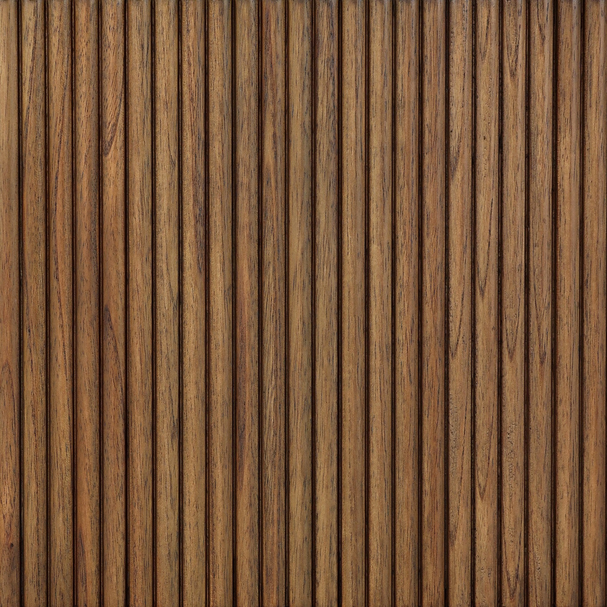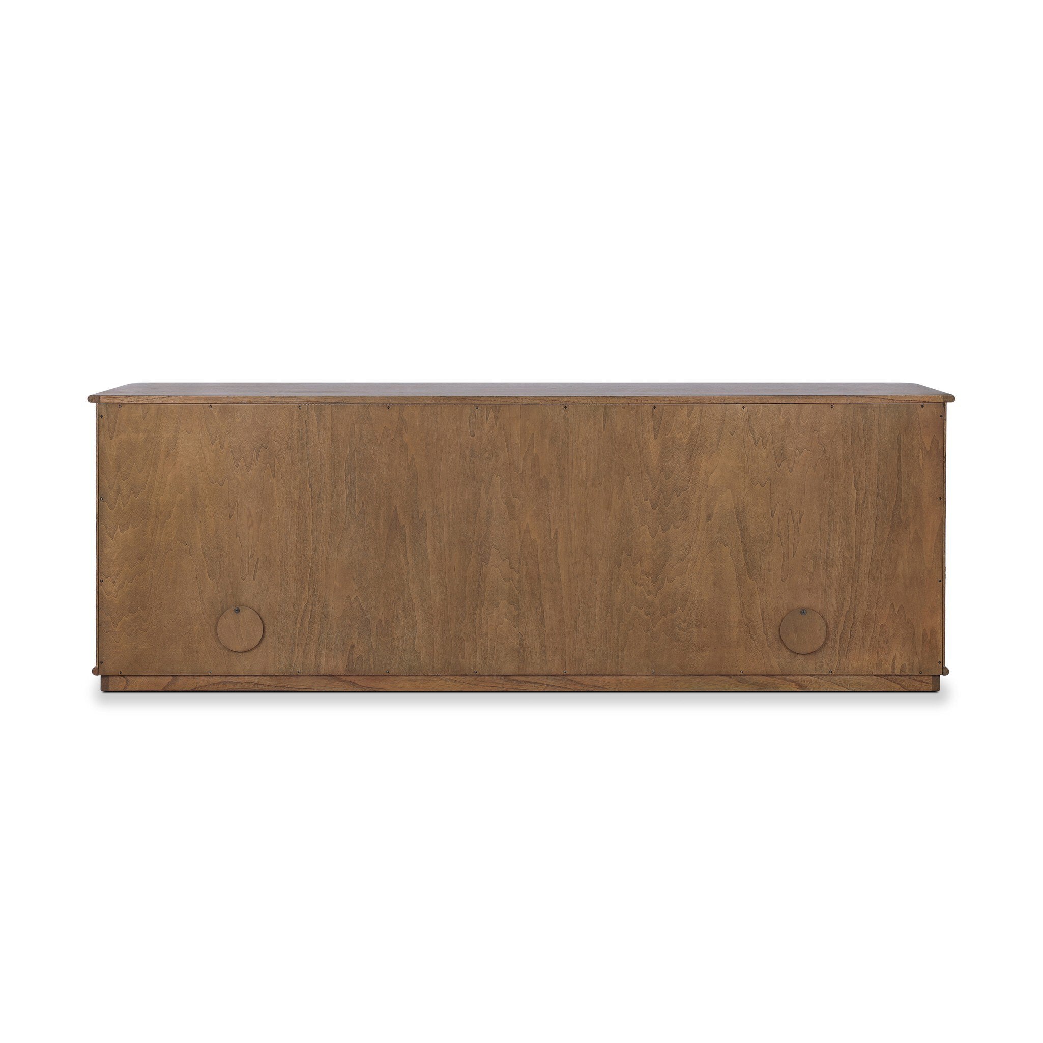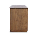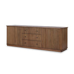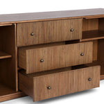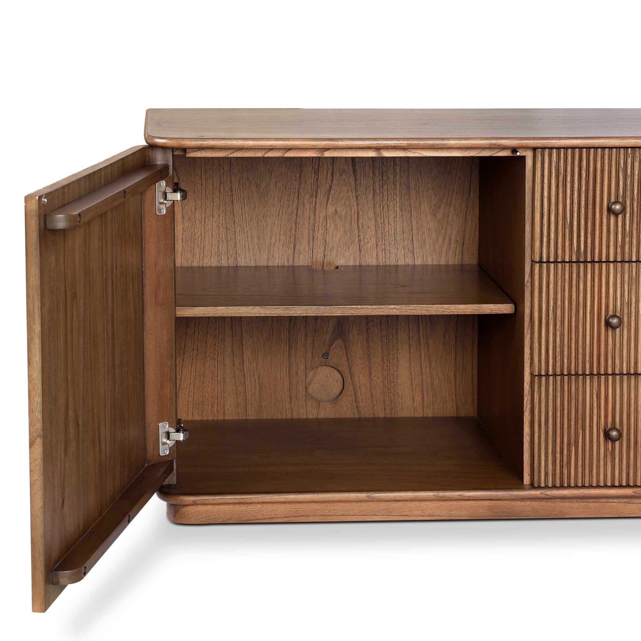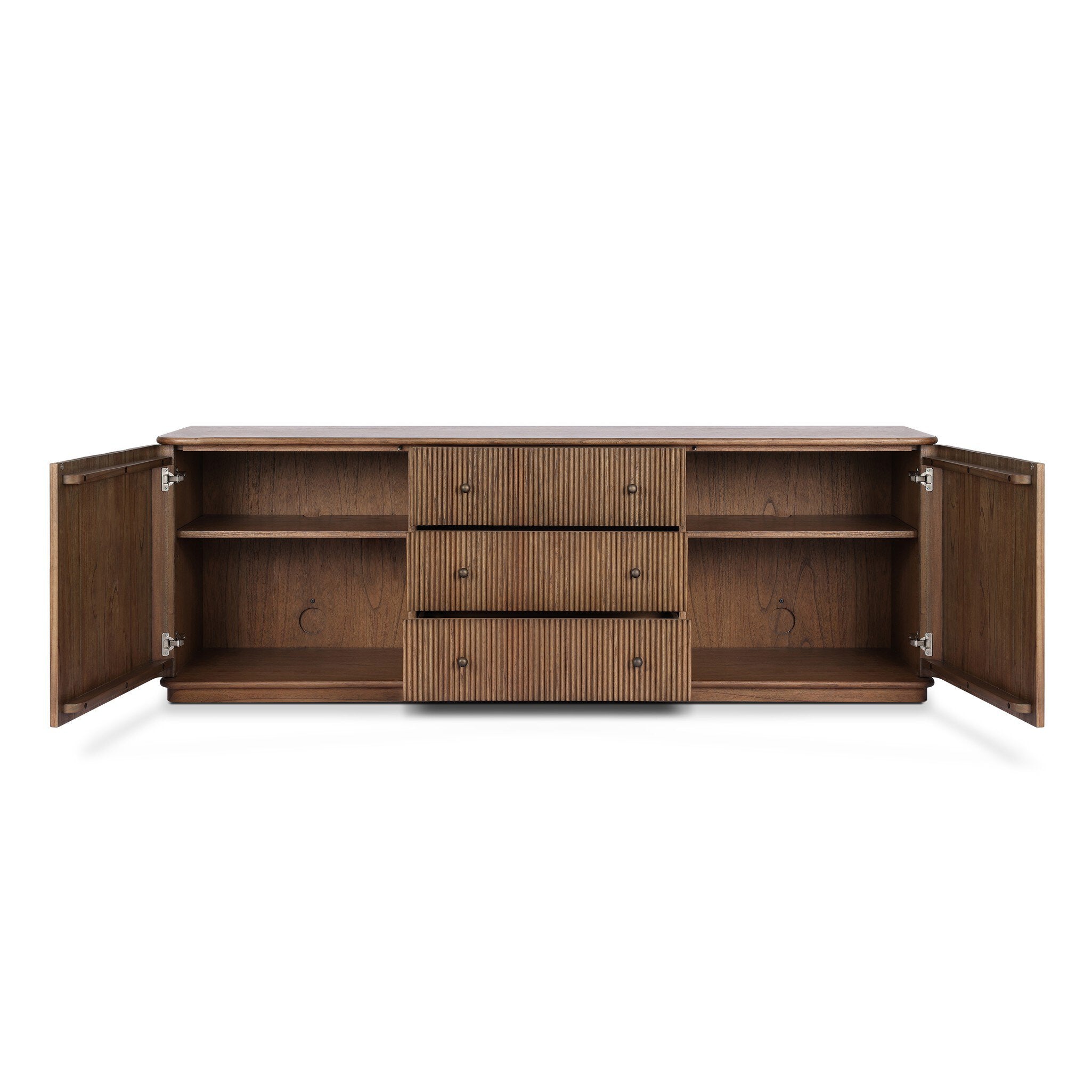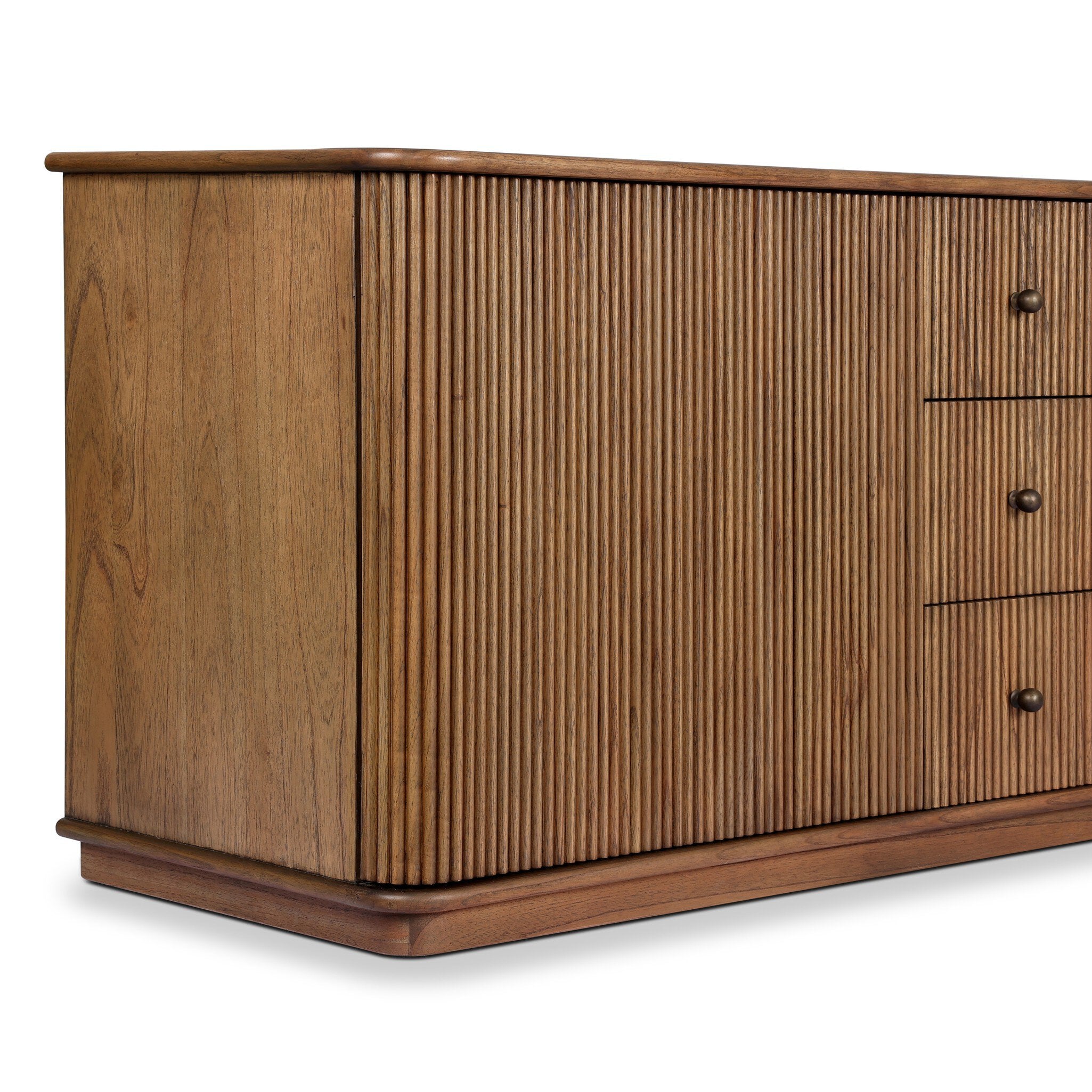 This media console exemplifies deliberate design through its mindi wood construction and carefully executed reeded detailing. The plinth-style foundation provides visual lightness while supporting a substantial, sculptural form. An expansive interior accommodates entertainment components and décor with ease, while the warm amber oak finish adds depth and sophistication to any living space.