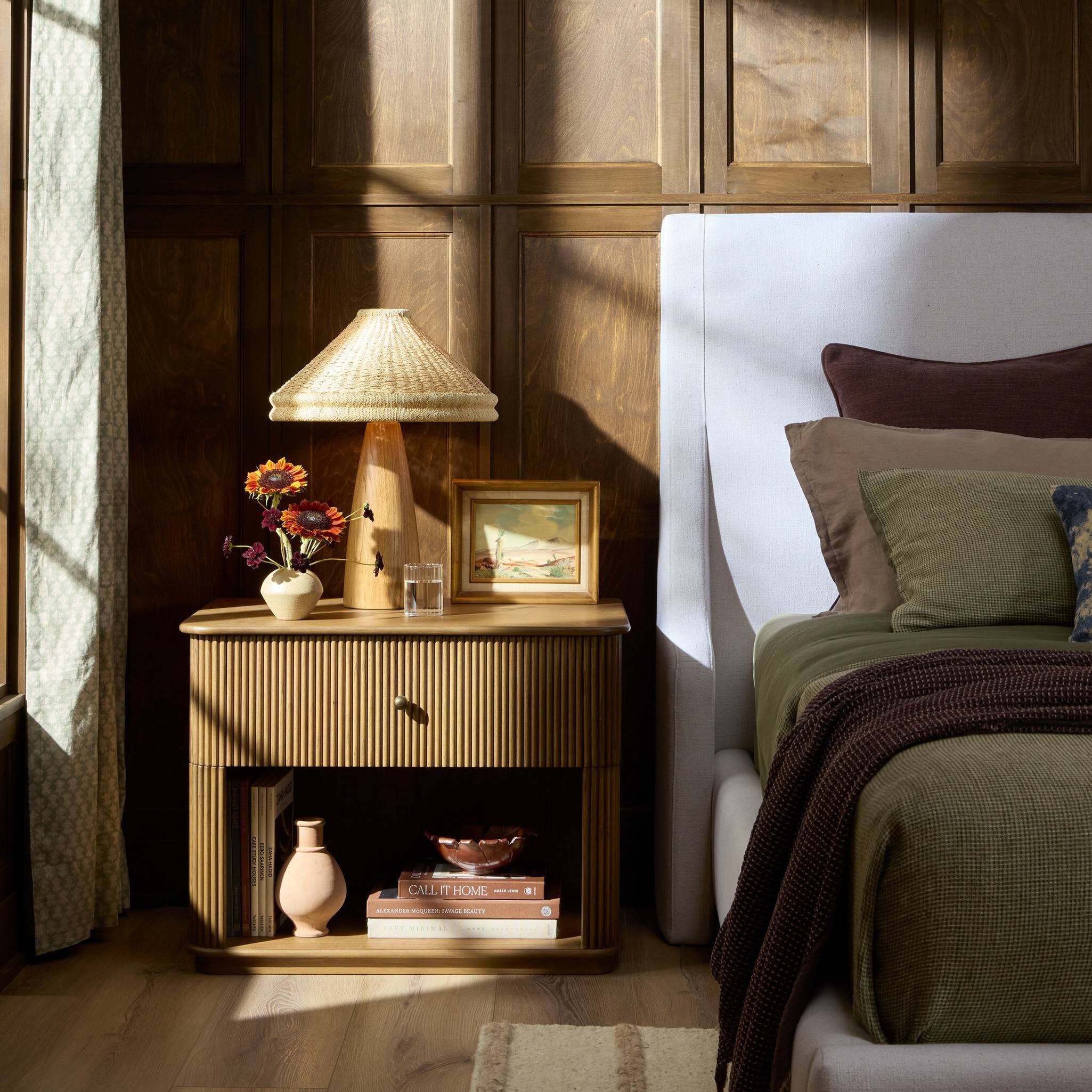 This bedside essential showcases meticulous artisanal construction through its mindi wood construction and distinctive reeded surface detailing. The plinth-style base anchors a thoughtfully proportioned silhouette, while the warm amber finish enhances its sculptural presence. Practical storage combines a generous drawer with an open cubby, offering flexible organization without sacrificing the piece's refined aesthetic.