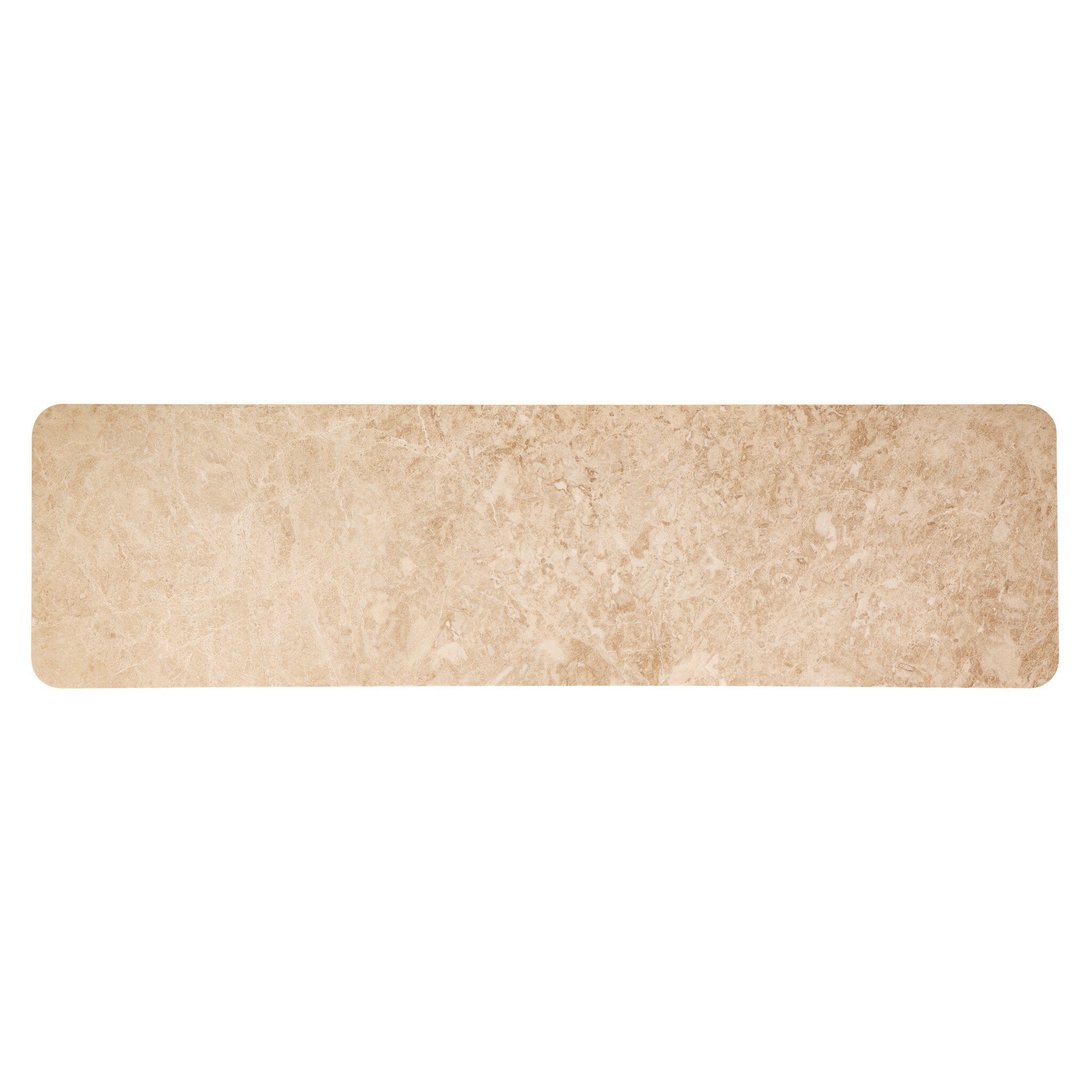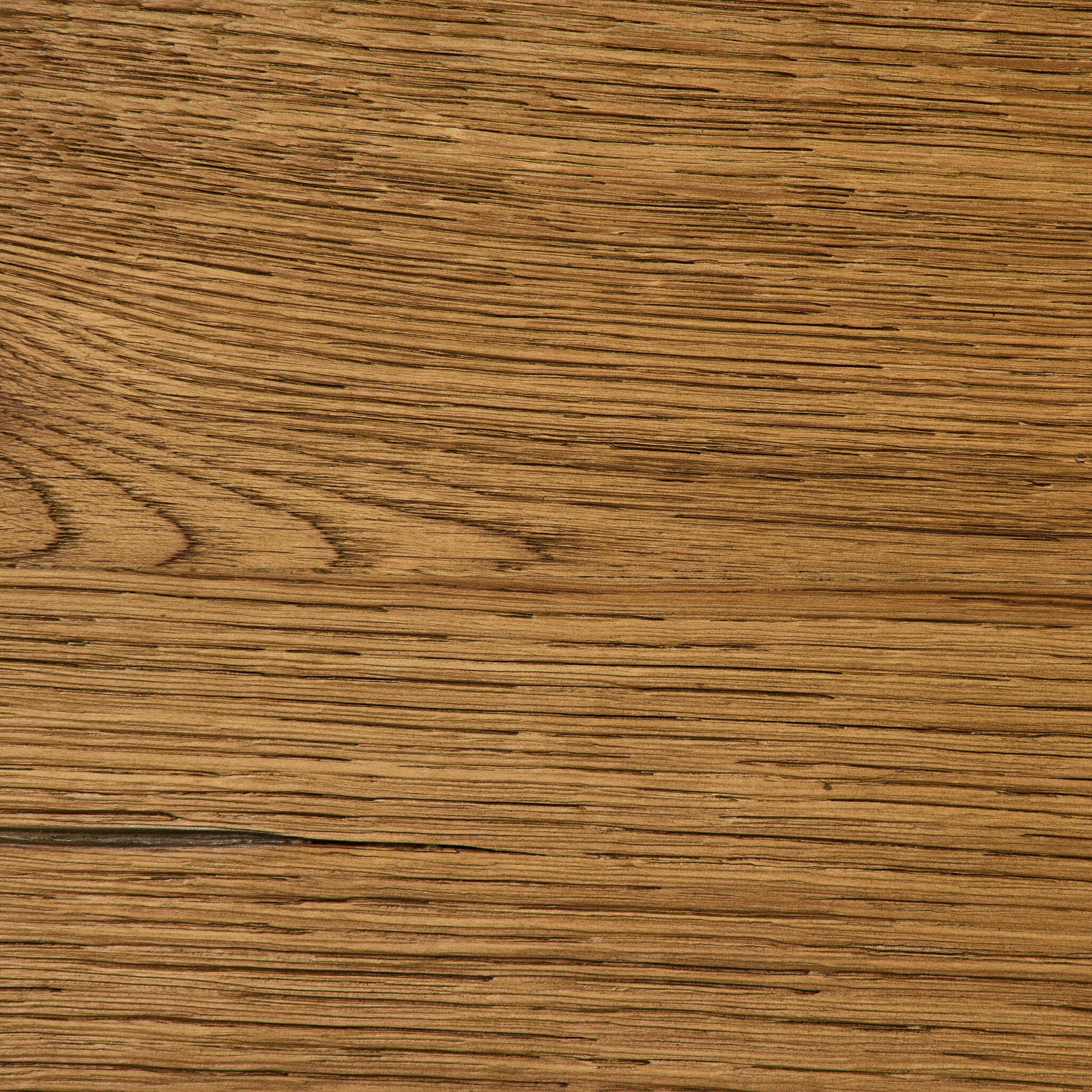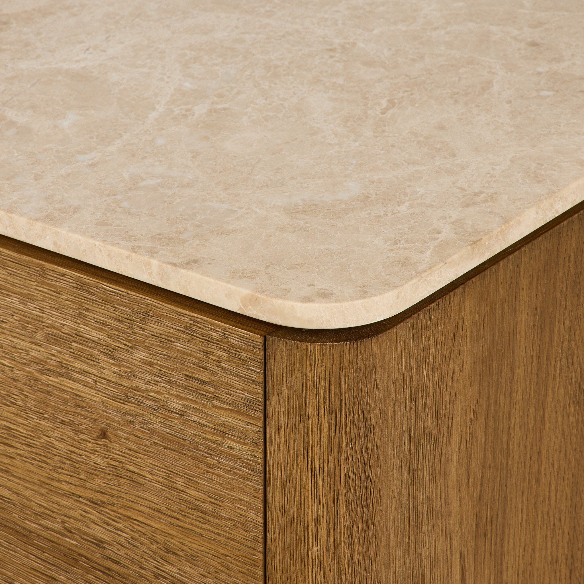 A smooth marble top adds refinement to a clean-lined dresser of worn oak with a plinth base and slate-brushed hardware. Six spacious drawers are finished off with soft-close undermount glides.