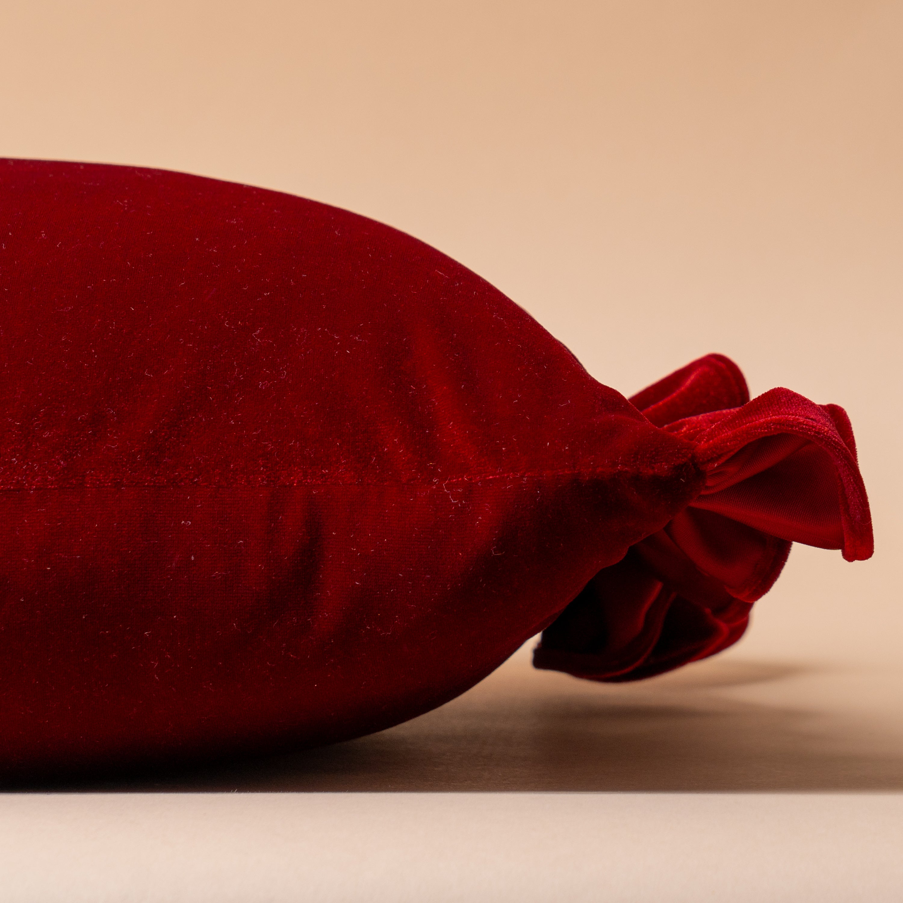 - red velvet pillow cover with ruffle edges on the sides