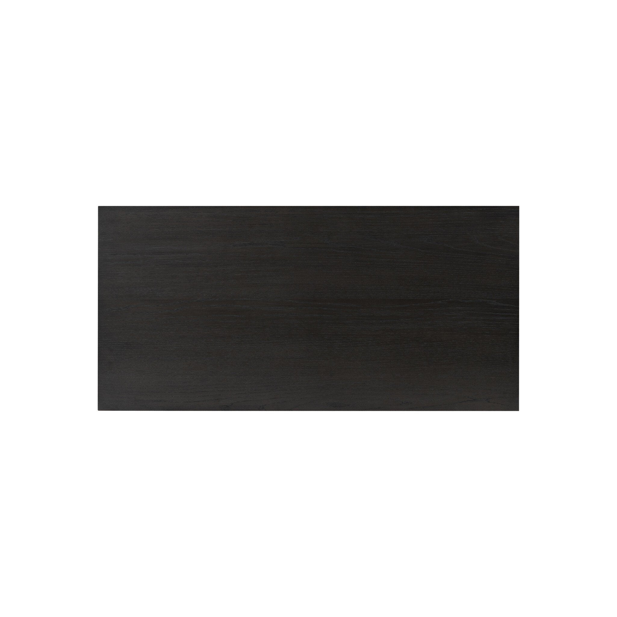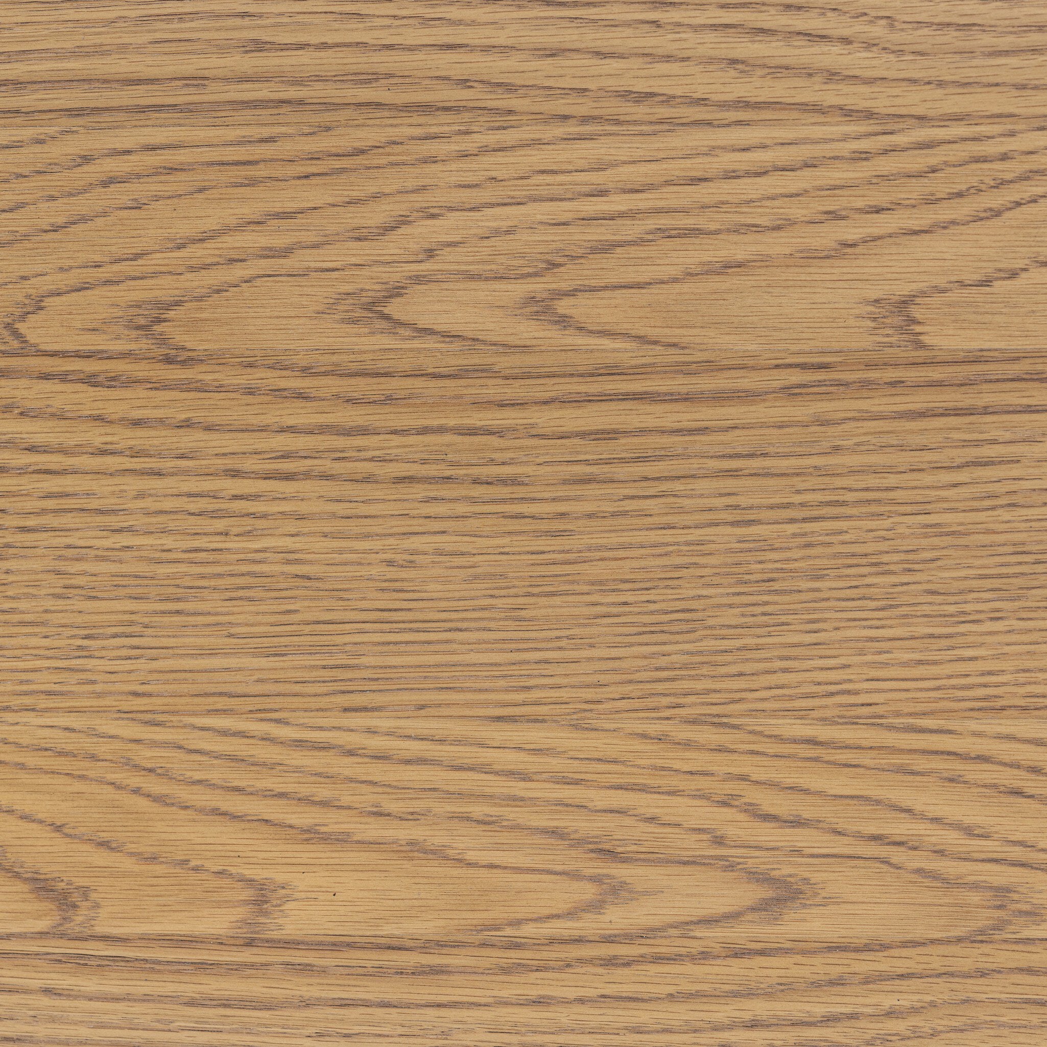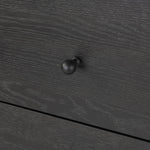 Create storage space in the bedroom with a five-drawer dresser of amber-finished oak. Chunky dowel legs support a tall silhouette and overhang top, all finished out with simple gunmetal hardware.