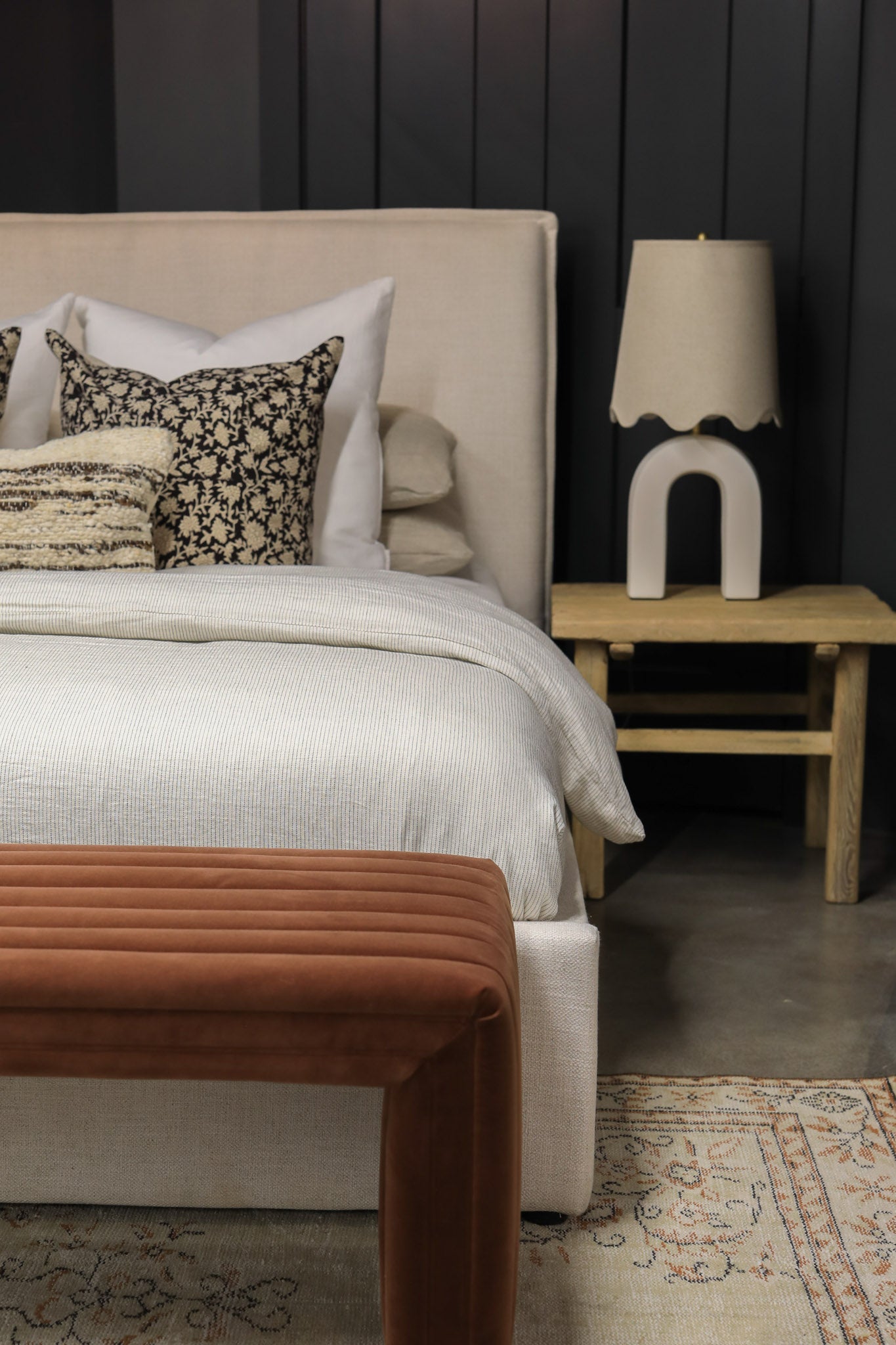 The magnet-inspired ceramic body and natural linen shade of the Roshani Table Lamp, distinguished by its tasteful scalloped detailing and antique brass accents, provides an unprecedented aesthetic without compromising its practicality.