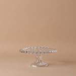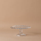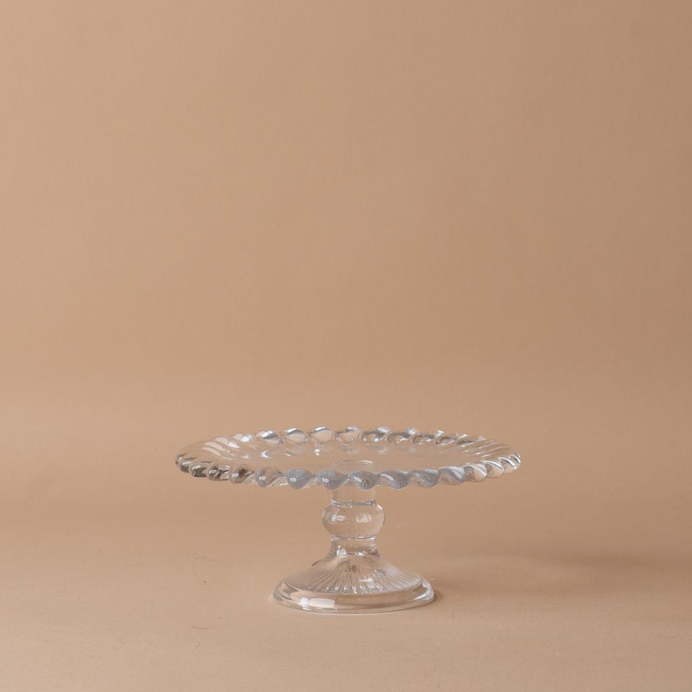 This small glass pedestal can be used in the kitchen to display charming confectionaries or as a decor item used to display objects.