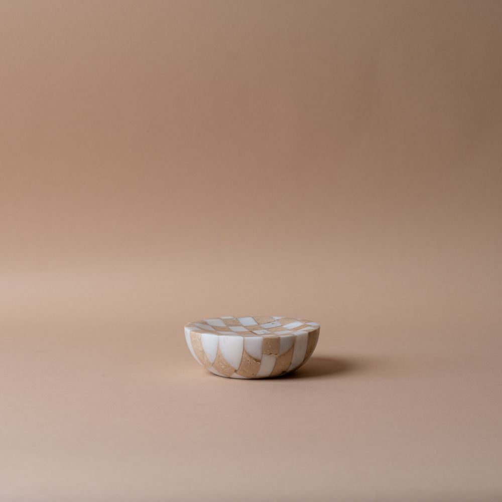 Crafted from natural travertine stone, this soap dish features an eye-catching checkered pattern that adds a sophisticated touch to kitchens and bathrooms. Its durable surface is ideal for holding soap, but it can also double as a stylish trinket dish.