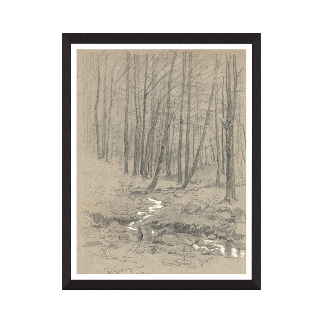 This pair of framed artworks captures the quiet elegance of the natural world through sepia-toned pencil drawings. One features the strength and texture of a towering oak trunk, while the other depicts the gentle flow of a forest creek. Subtle white highlights and earthy natural tones lend depth and softness, while the linen-textured frames enhance their timeless, organic appeal.